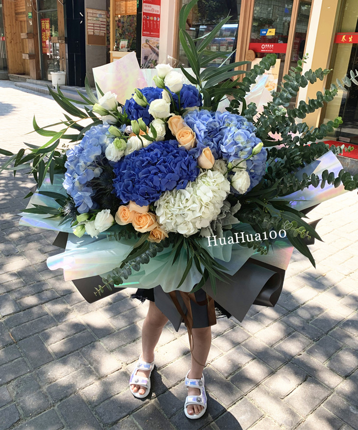 主花:香槟玫瑰11枝,浅蓝色,深蓝色绣球2枝,白色绣球2枝