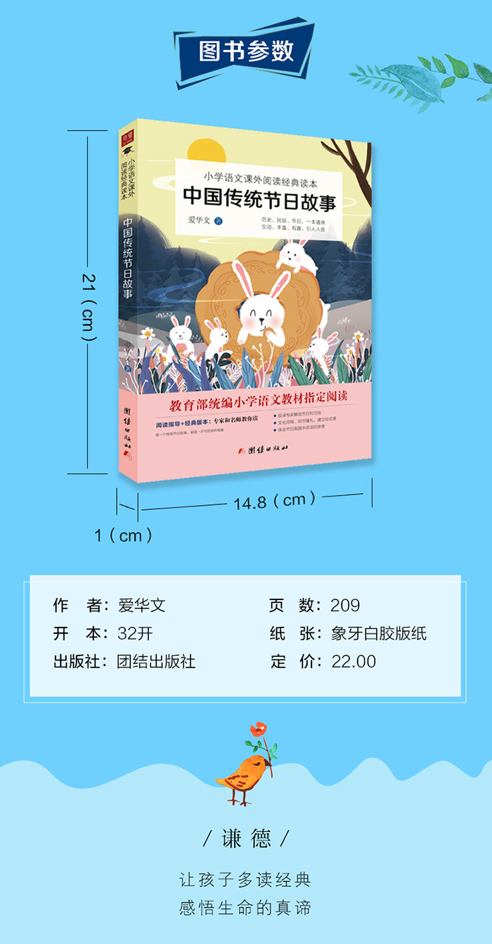 【基本信息】 书名:中国传统节日故事—小学语文课外读物 (收录专家解读节日和习俗,包含春节、元宵节、清明节、端午节、七夕节和重阳节等所有重大节日,中华传统文化读本,文化寻根,知节懂礼,建立仪式感,体会节日氛围中浓浓的亲情) 作者:爱华文 出版社:团结出版社 书号:978-7-5126-6430-2 出版日期:2018.10 版次:1 印次:1 页数:224 开本:32开 纸张:轻型纸 包装:平装 定价:22.00 【书籍目录】 第一章春节 一、万年历 二、贴春联 三、贴福字 四、迎财神 第二章元宵节 一、吃元宵 二、元宵节 三、闹花灯 四、猜灯谜 第三章二月二 一、龙抬头 二、爆米花 三、理头发 第四章清明节 一、寒食节 二、放风筝 三、荡秋千 四、插柳树 第五章端午节 一、悼念屈原 二、饮雄黄酒 三、吃粽子 四、跳钟馗 第六章七夕节 一、牛郎织女 二、穿针乞巧 三、喜蛛应巧 四、为牛庆生 第七章中元节 一、地官赦罪 二、目连救母 三、烧纸钱 四、送羊节 五、放河灯 第八章重阳节 一、九九重阳 二、恒景斩魔 三、登高避灾 四、兄弟情深 五、白衣送酒 第九章冬至节 一、冬日来临 二、冬至大如年 三、饺子来历 四、孝母节 第十章腊八节 一、赤豆打鬼 二、佛祖得道 三、腊八粥 第十一章小年 一、祭灶王 二、大扫除 三、吃年糕 四、剪窗花 第十二章除夕 一、年夜饭 二、贴年画 三、屠苏酒 四、压岁钱 【编辑推荐】 1、版本完善,文质俱美,孩子爱读 摒弃浮华,专注文字,平实流畅,文字更贴近小学生 2、经典名著,版权保障,彰显实力 融聚众多版权书,汇集知名翻译家作品,节选经典篇章 3、难字注音,难词注释,阅读指导 难字标注拼音,生词添加注释,老师指导阅读方法 4、字大行疏,环保印刷,装订结实 采用护眼轻型纸,排版精致,字体清晰,久看不累 【内容简介】 本书中包含了春节、元宵节、清明节、端午节、七夕节和重阳节等所有重大传统节日,将中国传统节日的来源、习俗、文化内涵,融入到贴近儿童生活的故事里。每一个传统节日故事,都是一次与历史的相遇,都是一次想象力的丰富和艺术的熏陶。节日故事内容生动活泼,充满童趣,保持了中华文化的端庄大气,同时让孩子们领略了中华文化中特别有意义的瞬间,不仅带孩子了解了农耕文明的和谐自然观,也让孩子品味到千年的民族文化积淀。通过《中国传统节日故事》感受原汁原味的节日气氛,体会节日的欢愉和家庭的亲密,得到中国优秀传统文化的滋养。 【媒体评论】 了解中国传统文化,让孩子的心灵得到优秀传统文化的滋养。 体味浓浓的爱和亲情。节日是举家团聚的日子,让温馨的亲情时光成为陪伴孩子一生的美好记忆。 【在线试读部分章节】 一、万年历 正月初一这天,家家户户放鞭炮,人人脸上喜洋洋。邻居们穿着新添的衣裳,见面都互相说“春节好”。爷爷张罗着吉祥一起在窗户上贴福字,在门上贴春联。吉祥手舞足蹈,乐不可支,他边忙活边感叹:“春节好热闹啊!” “是啊,春节是咱们中华民族最盛大、最隆重的传统节日,它意味着新年的开始。人们为了欢度春节,会举行特别多的庆祝活动,像贴春联啊、贴福字啊、迎财神啊、给亲朋好友拜年啊,每个地方都有自己独特的风俗。”爷爷非常有学问,春联上的毛笔字都是他自己写的。 “春节是怎么来的啊?为什么是正月初一呢?古时候的人怎么知道今天是几月几号啊?”吉祥来了兴趣,连续发问。 “嘿嘿,问题挺多啊,给你讲几个故事你就知道啦。 “咱们中国有五千年的悠久历史,也有很多的朝代,其中最早的三个朝代依次是夏、商、周。 “商朝有一个皇帝叫祖已,他是个好皇帝,心中装着百姓,但是有一件事一直困扰着他。商朝所处的这个时期天文地理方面的知识非常匮乏,人们不知道一年究竟有多少天,也不知道现在处于什么季节,老百姓们只能依靠长辈们的生活经验来推算今天是什么日子。 “古代中国是个农耕国家,大家都靠种田种地来维持生活。种田种地需要知道节令,要搞清楚什么时候播种插秧,什么时候采摘收获,还要知道一年当中从什么时候开始进入夏天,什么时候开始进入冬天,这样才能干好活儿。可是大家对这些都一头雾水,所以人们的生活一塌糊涂。 “皇帝很发愁,想解决这个问题,但是他和大臣们都不懂历法,不知道怎么推算节气时间。于是皇帝向全天下的百姓征求计算时间的方法和工具,希望造福于民。 “在离京城不远的地方,有一座山叫做定阳山,这里山清水秀,是个好地方。山下有一个小村庄,村庄里住着一个叫万年的小伙子。他家里也是种地的,因为节令很乱,他辛辛苦苦、兢兢业业地干活,但总是没什么收获。 “他为人积极乐观,慢慢产生了一个想法,他想研究太阳月亮的运动规律,从而来推算节令、季节和时间。但是这个学问太大啦,万年不知道从何处下手。 “某天,他上山砍柴,累了坐在树下背靠着树干睡午觉。等他醒来的时候,看到树干投在地上的影子变长了,而且还移动了方向。他非常感兴趣,开始观察影子的变化过程。这一研究就上瘾啦,每天都抽空来研究影子。经过长期的观察和分析,他终于掌握了影子的变化规律,而且制造出一个叫日晷的仪器。 “这个仪器由两部分组成,一部分是大圆盘,圆盘上有刻度,不同的刻度上写着不同的时间和季节。大圆盘中间有一根针,在太阳的照射下,针的影子指向具体的刻度,这样就可以知道现在是几月