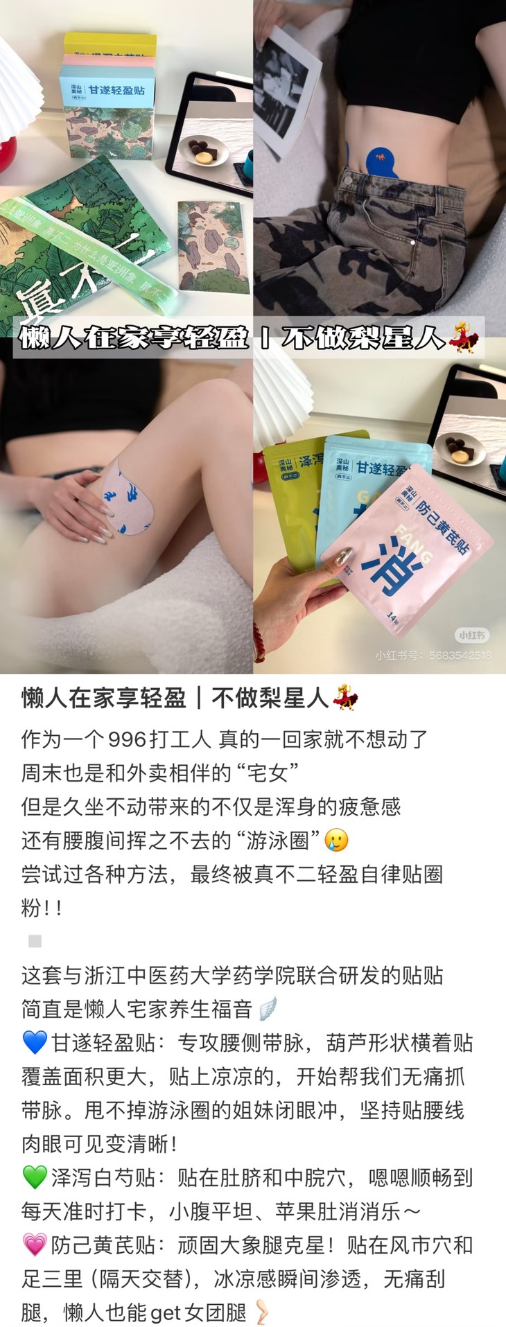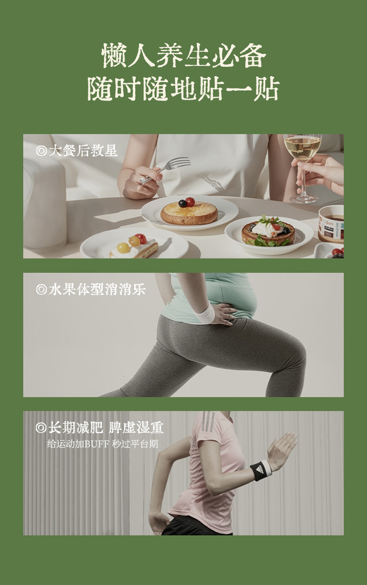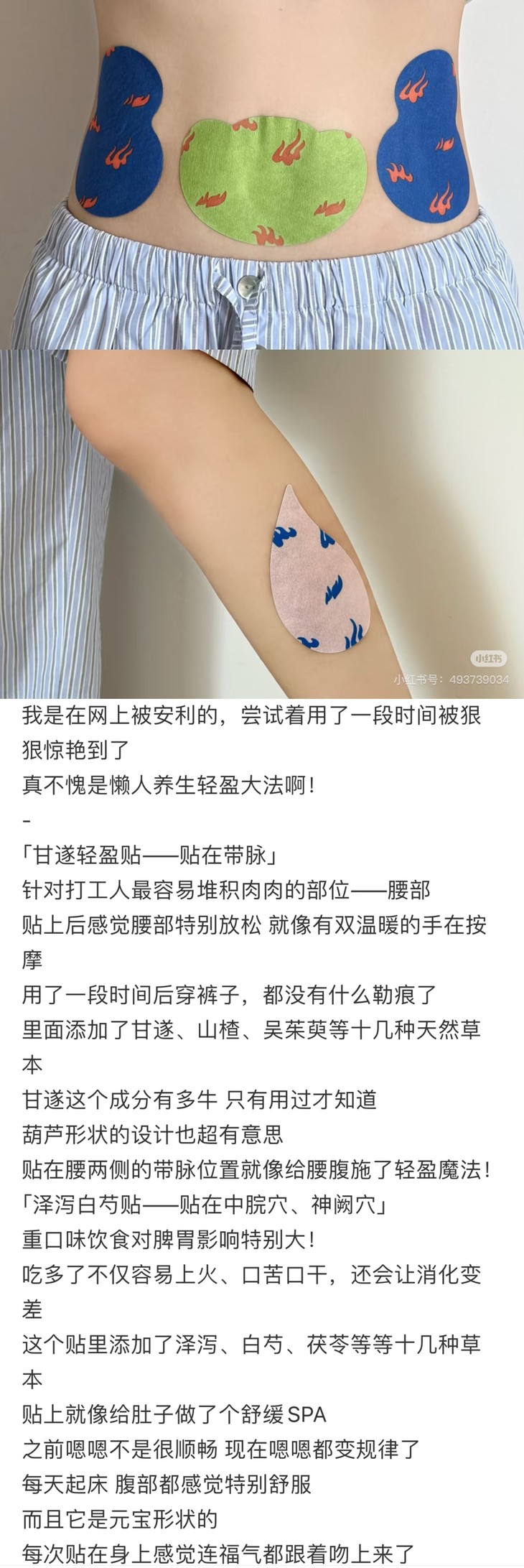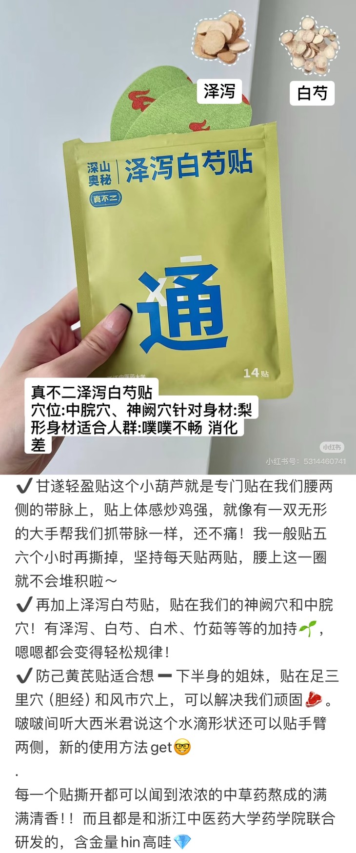 泽泻白芍贴是绿色的,能疏通中焦,养出“少女腹”。它针对肚胀、口气重、头身困重、腹泻积食、消化不良等中焦运化不佳的问题。成分里,泽泻、茯苓能利水渗湿,加速水湿排出;白芍、白术养血柔肝,健脾益气;陈皮理气消积,缓解肚胀;山楂、红曲消食健胃,活血化瘀;黄连、金钱草清热燥湿,改善口气与消化问题;黄莲、甘草则能补气健脾,调和诸药,增强体质。总的来说,可以祛湿健脾,加速中焦运转,疏导水湿运化,改善消化系统功能,解决肚胀积食,让腹部更平坦轻盈。