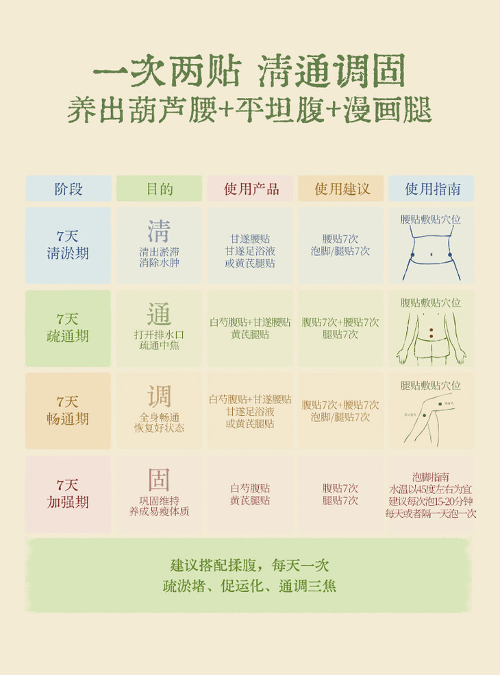 彩虹贴建议以7天一周期。清淤期,每日1次甘遂腰贴加1次黄芪腿贴,清淤滞、消水肿。疏通期,每日1次泽泻白芍腹贴加1次甘遂腰贴,进一步打开排水口,疏通中焦。畅通期,每日1次腹贴加1次腰贴加1次泡贴(泡脚或腿贴),促进全身通畅,恢复良好状态。加强期,每日1次腹贴加1次黄芪腿贴,巩固效果。