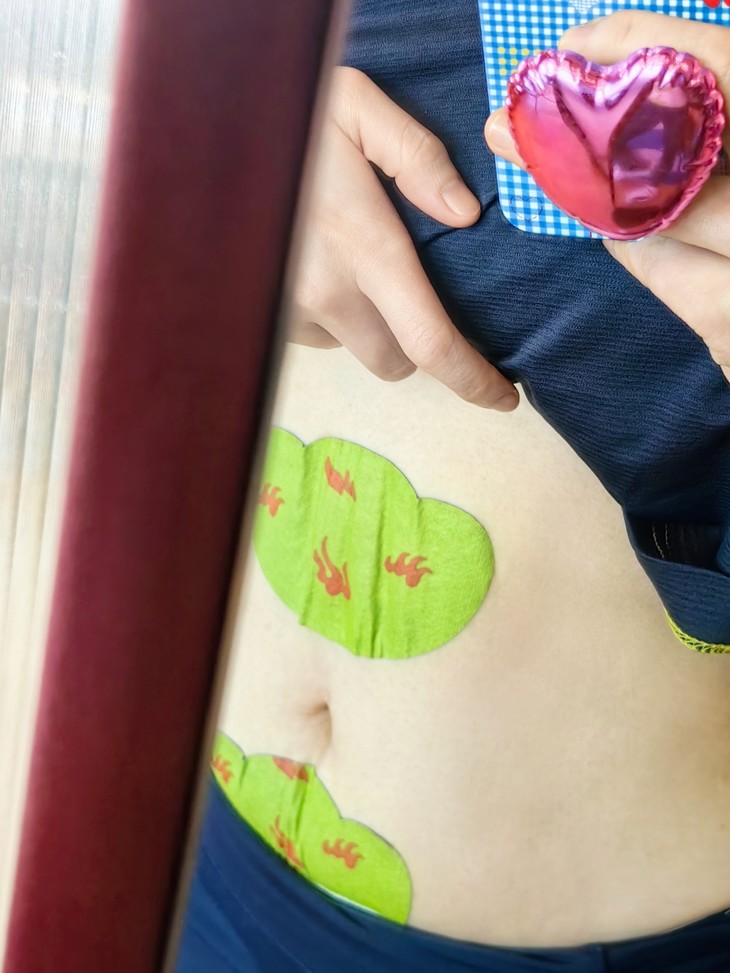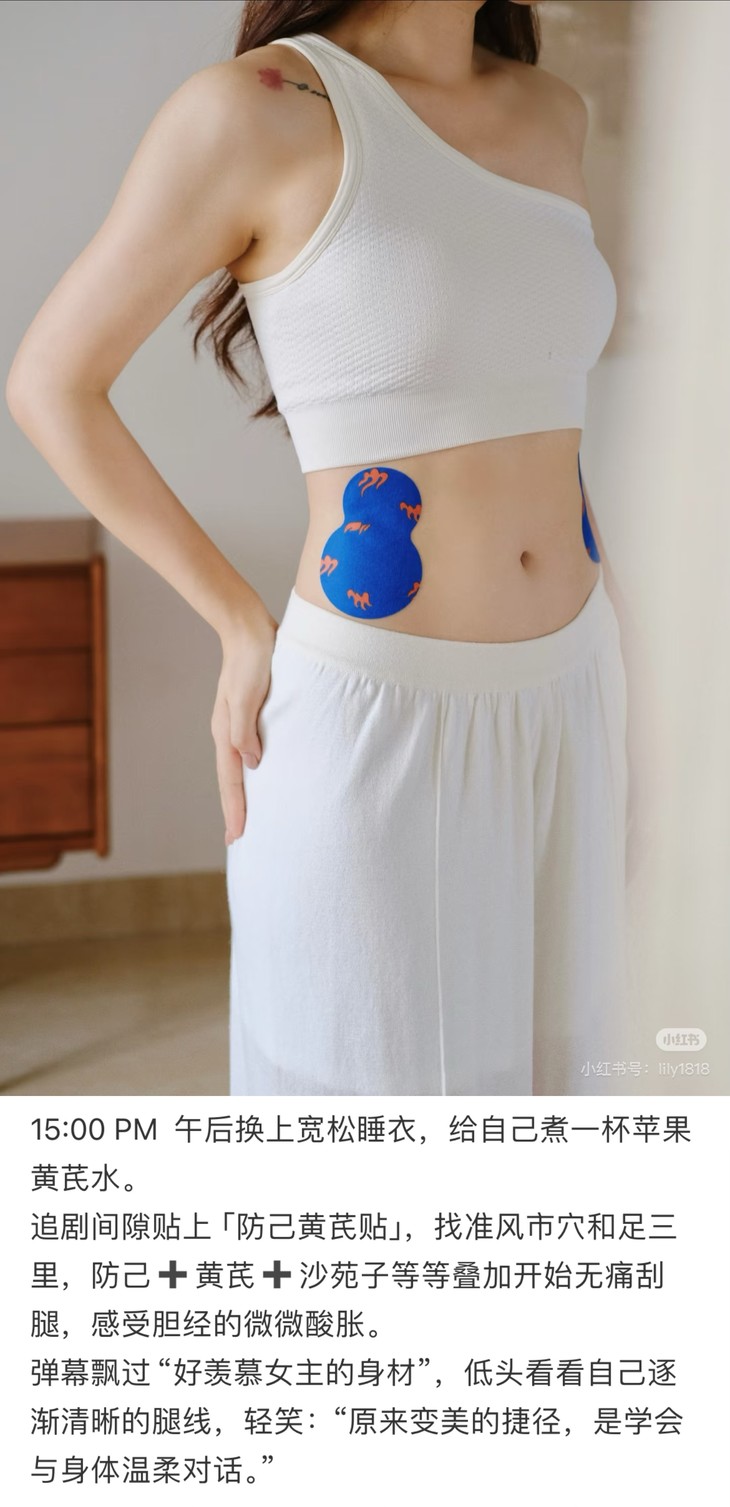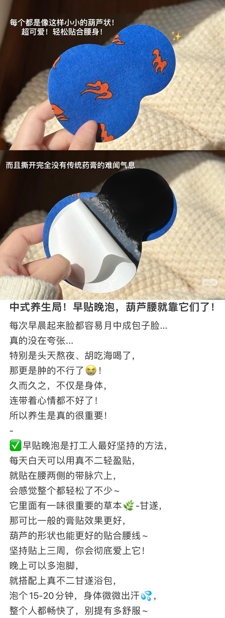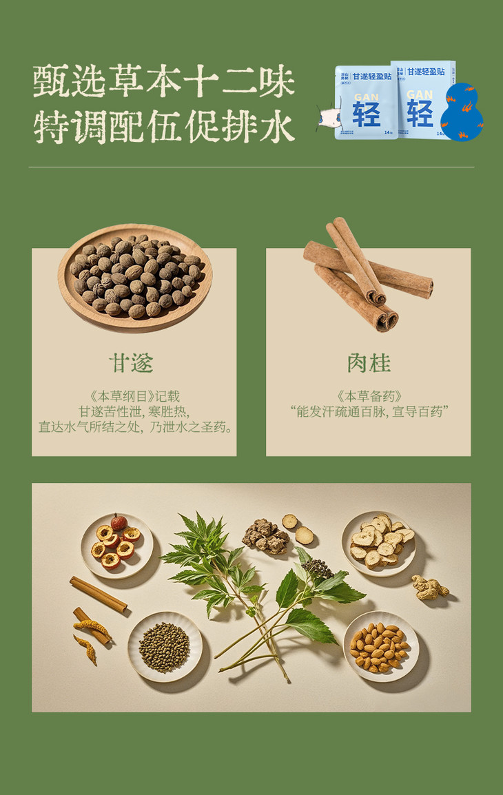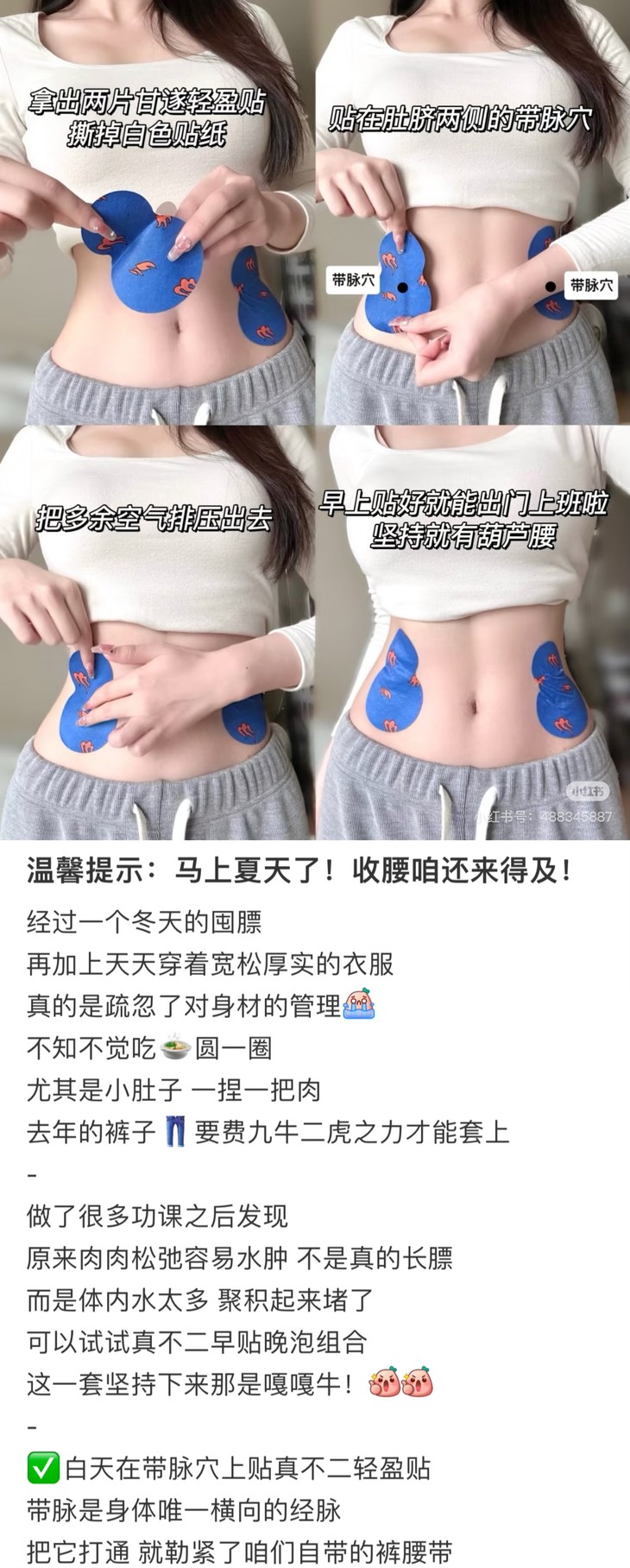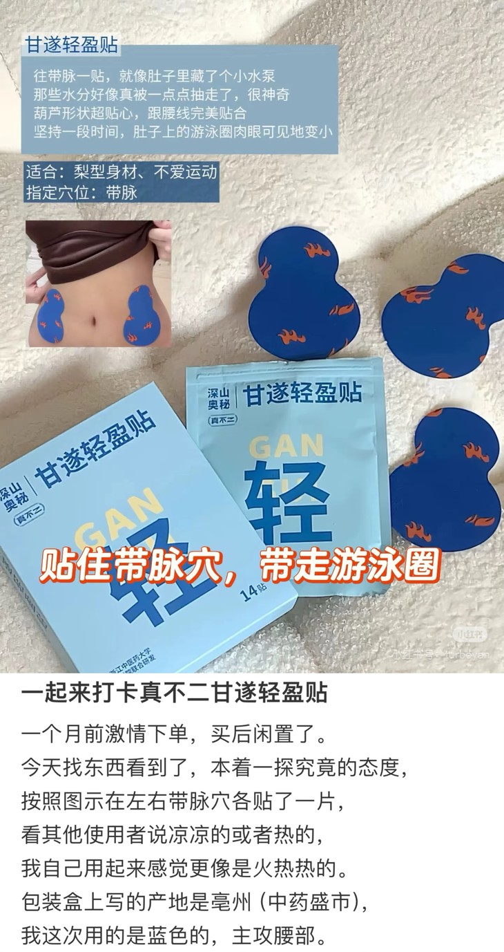 甘遂轻盈贴是蓝色的,专攻腰腹,塑造“葫芦腰”。它适用于腰腹部湿寒堆积导致的小肚鼓鼓、带脉不通,以及久坐不动、饮食不节制、排便不畅等引发的腰腹水肿、虚胖问题。其核心成分中,甘遂能直达水气郁结处,泄水祛湿,是水肿胀满的“克星”;肉桂可发汗疏通百脉,温阳散寒,助力药效传导;白术利水渗湿、健脾燥湿,双重排水;干姜、艾草、紫苏温经散寒,活血通络;火麻仁、肉苁蓉润肠通便,加速代谢;桃仁、山楂则能活血化瘀,改善局部循环。这些成分协同作用,能打开腰腹“排水口”,促进带脉通畅,缓解水湿停滞。