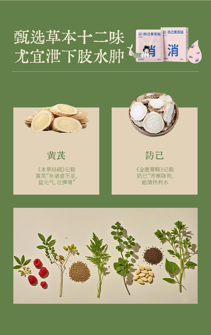 防己黄芪贴是粉色的,聚焦下肢,适用于大象腿、浮肿、腿寒、酸胀松弛等,改善经络淤堵与循环不畅。其中,防己祛风止痛、清热利水,专攻下肢水肿;黄芪补气升阳、利水消肿,增强下肢循环动力;木通利水通淋,加速多余水分排出;桃仁养血活血,疏通经络淤堵;艾草、紫苏能温经散寒,缓解腿寒与酸胀。这些成分共同作用,疏通腿部经络,通调下焦,改善血液循环,消除水肿,缓解腿寒、酸胀,也让双腿更纤瘦紧致。