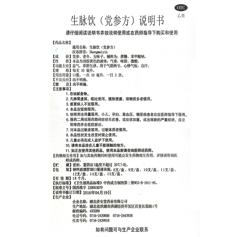 济安堂生脉饮(党参方)10ml*10支/盒心悸气短盗汗乏力气短口干