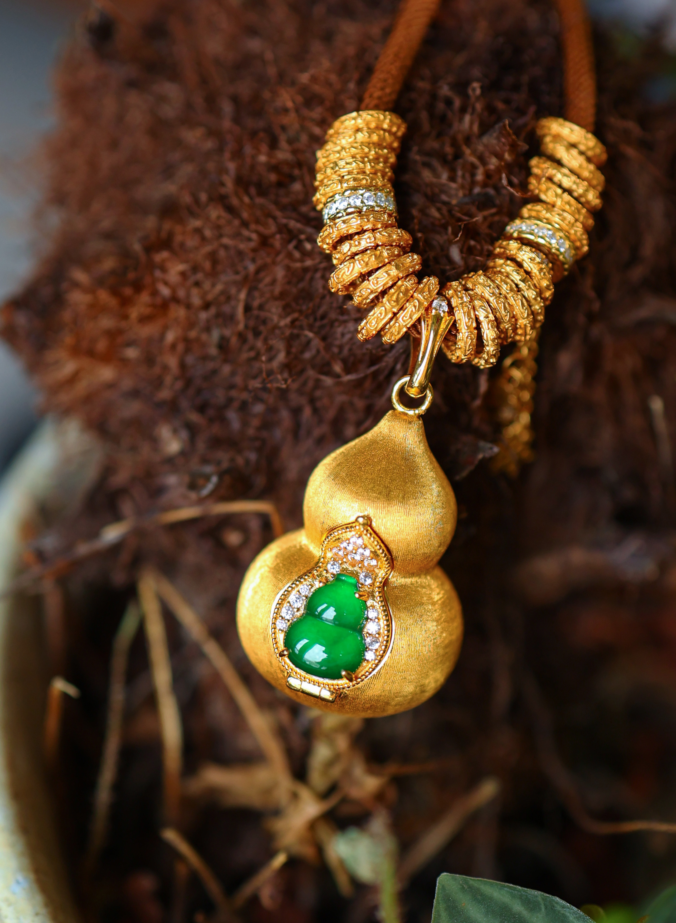 中间镶嵌一颗高冰翡翠葫芦。点缀宝石碎钻。