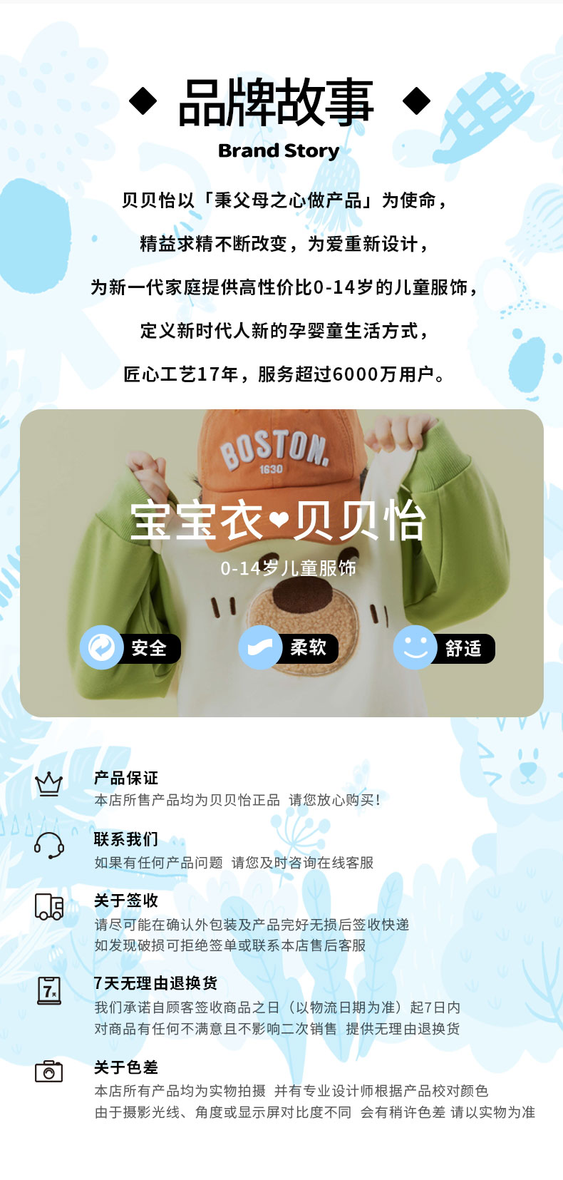 贝贝怡专注0-6岁婴幼儿服饰,坚持安全、柔软、舒适的产品理念,为千万中国家庭提供超高品质、安全可靠的婴幼儿服饰产品,妈妈放心,宝宝开心!