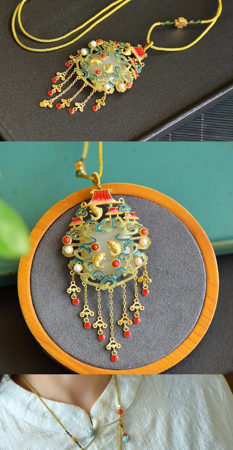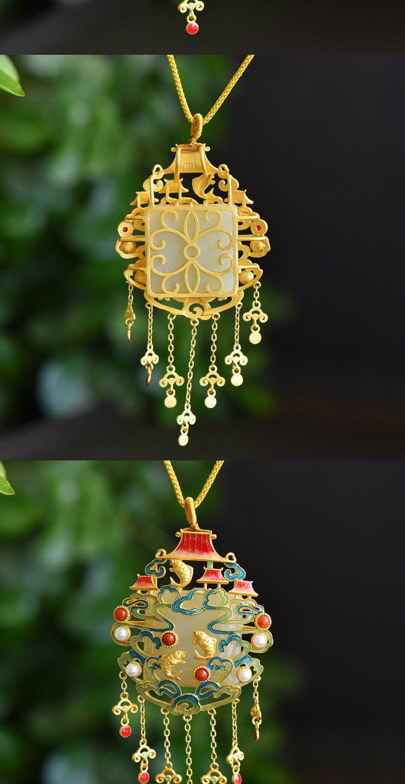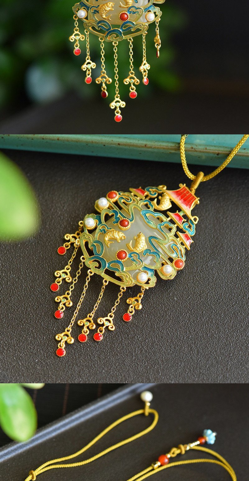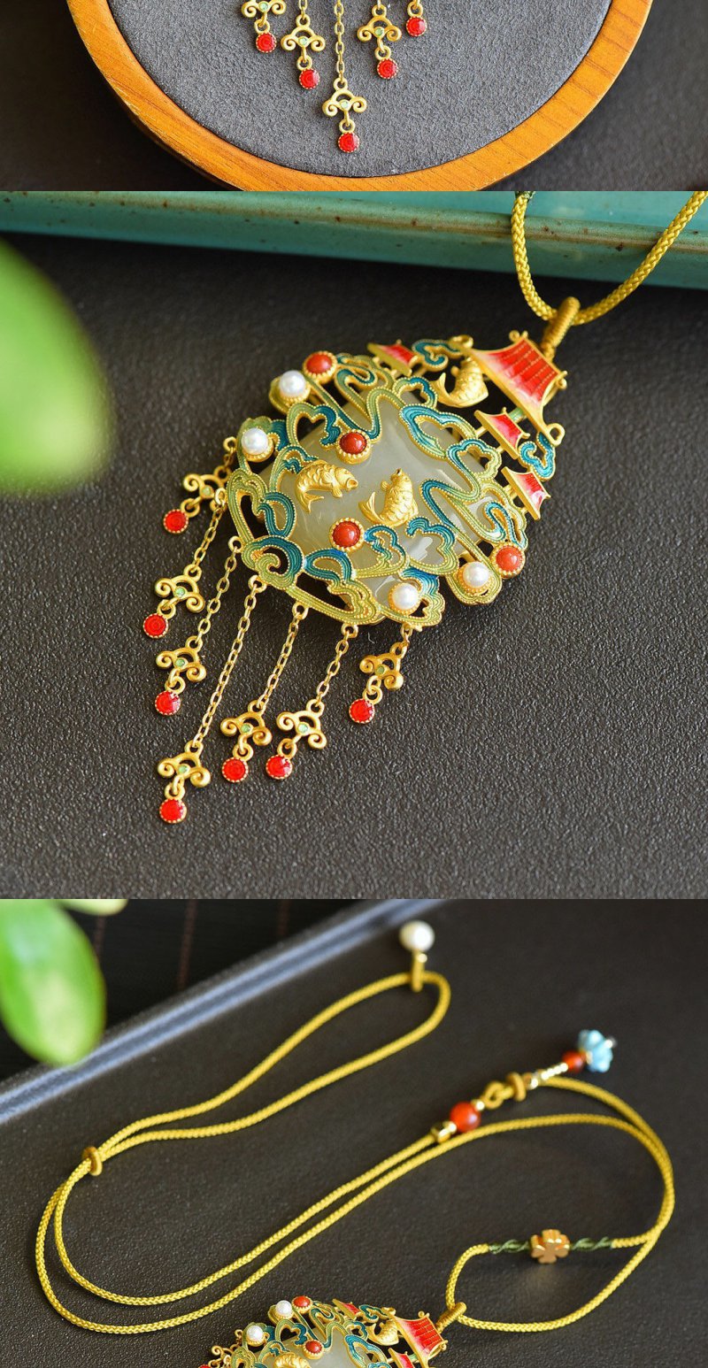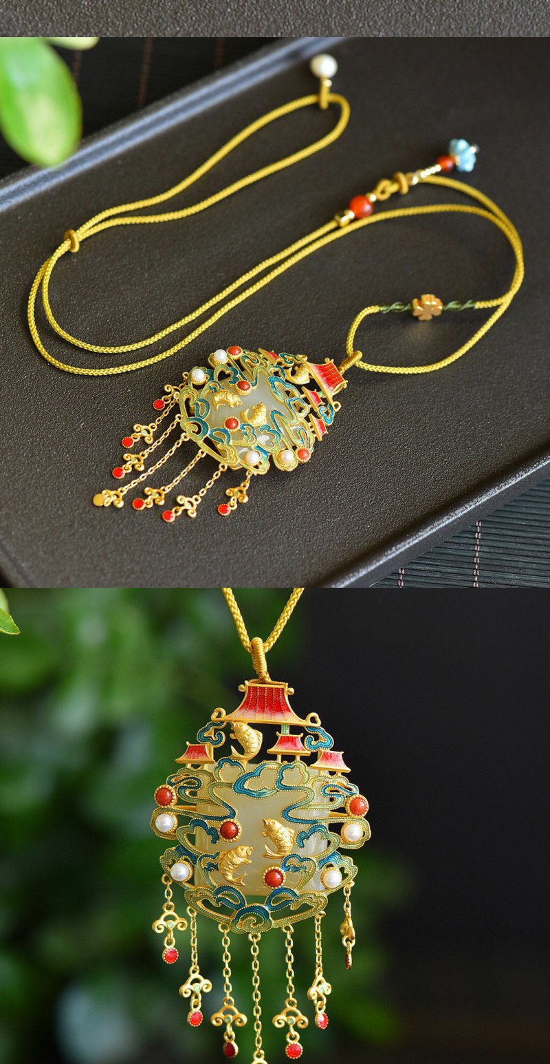 鱼跃龙门天然和田玉项链女S925纯银复古项链女民族风中国风毛衣链