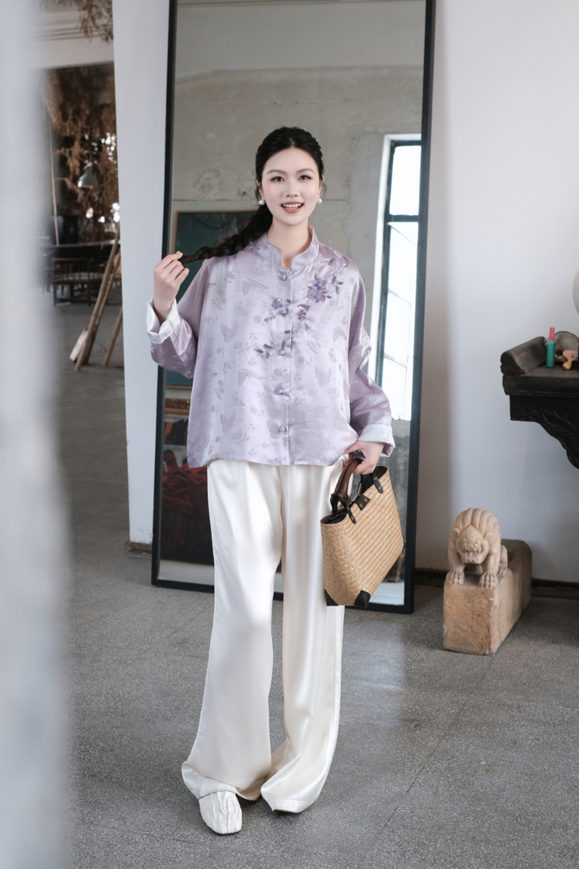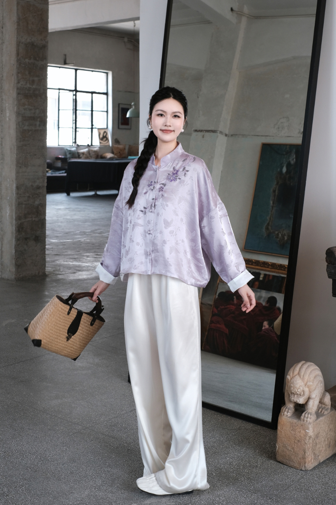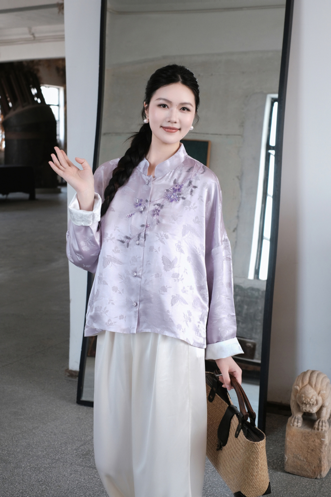 盛唐牡丹 |真丝紫蝶串珠双面穿外套