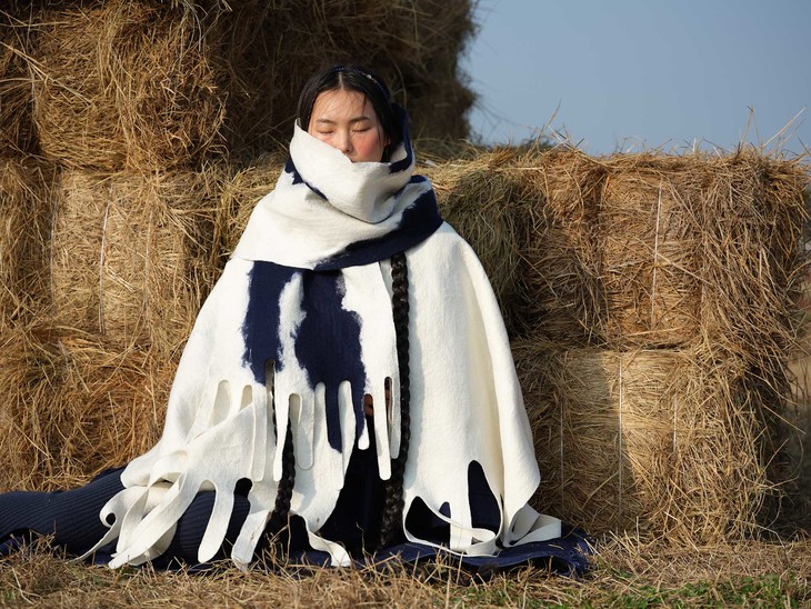 羊绒本身与生俱来的光泽感与柔软手感结合羊绒毡化后带来的独特质感,呈现出天然浑厚之美。