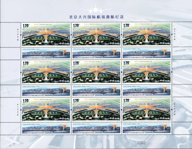 该套邮票采用主附票的设计形式,构图饱满,充满张力。邮票以机场航站楼的外形作为画面主体,完整展现了呈放射形的五条指廊,充分体现出大兴国际机场空间延展性强的特征,具有较强的视觉辨识度;附票以航站楼剖面图为主体,直观展示出航站楼内部复杂的空间结构,同时通过表现轨道交通、公路交通,体现了北京大兴国际机场新型国际化立体综合交通枢纽的定位。