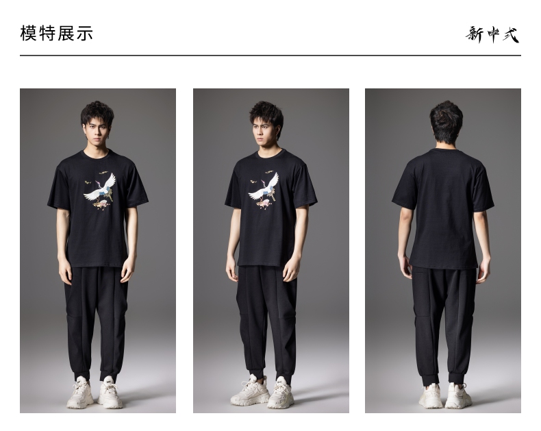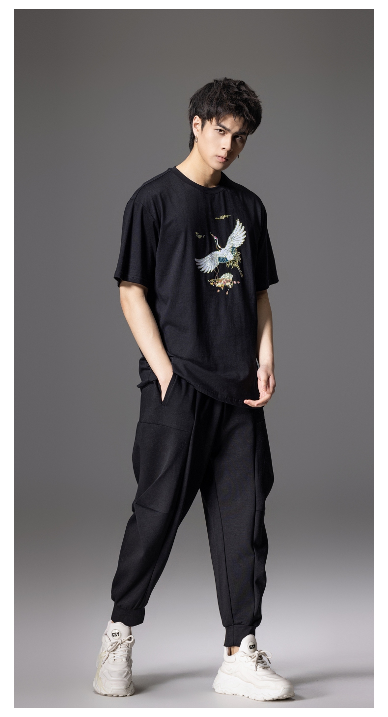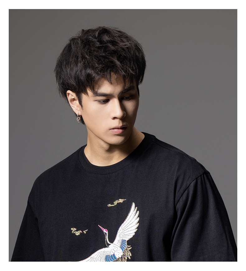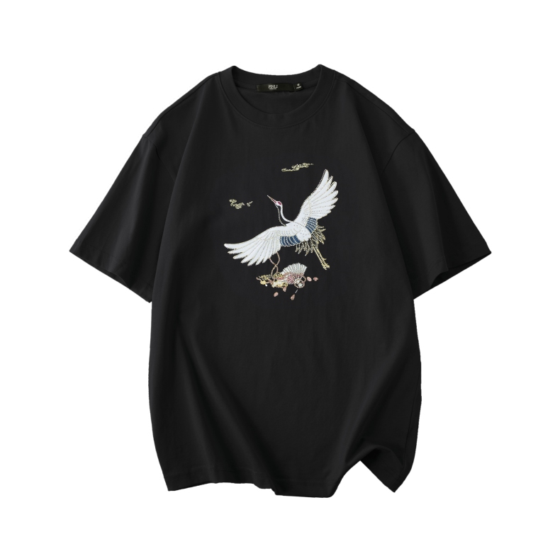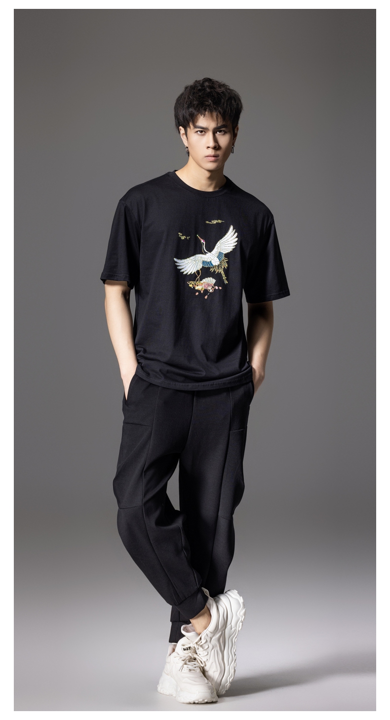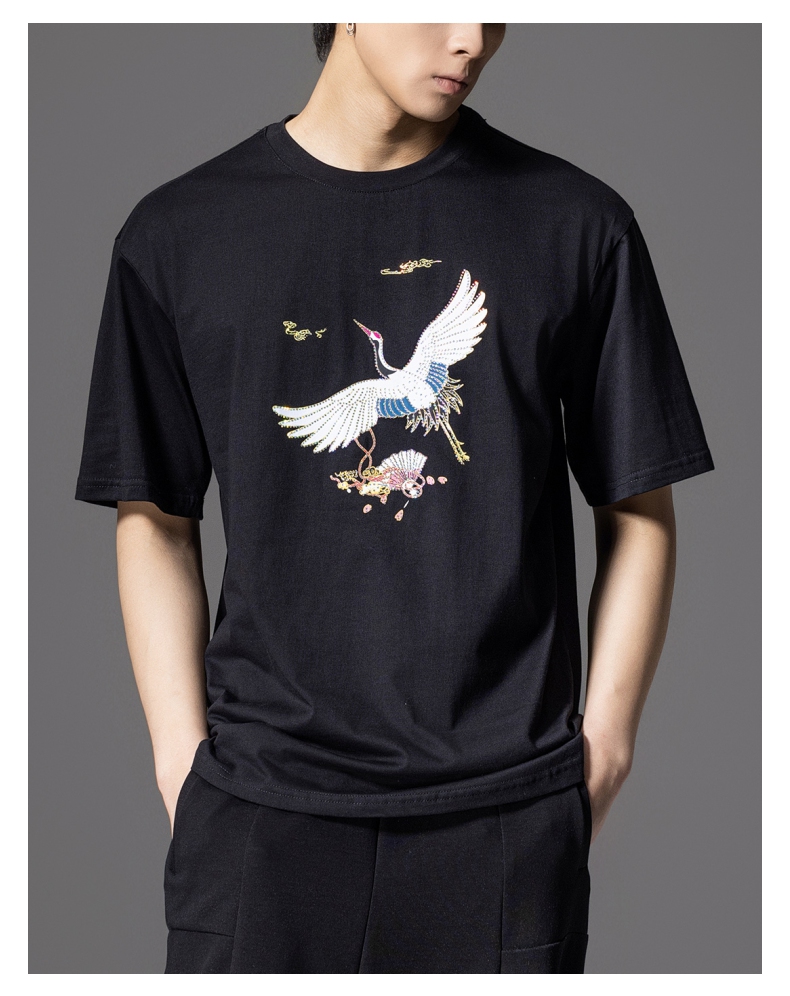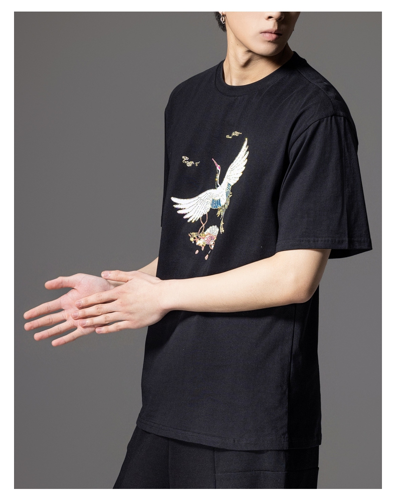 PINLI品立新中式2024夏季新款男仙鹤祥云烫钻短袖T恤BG242111024