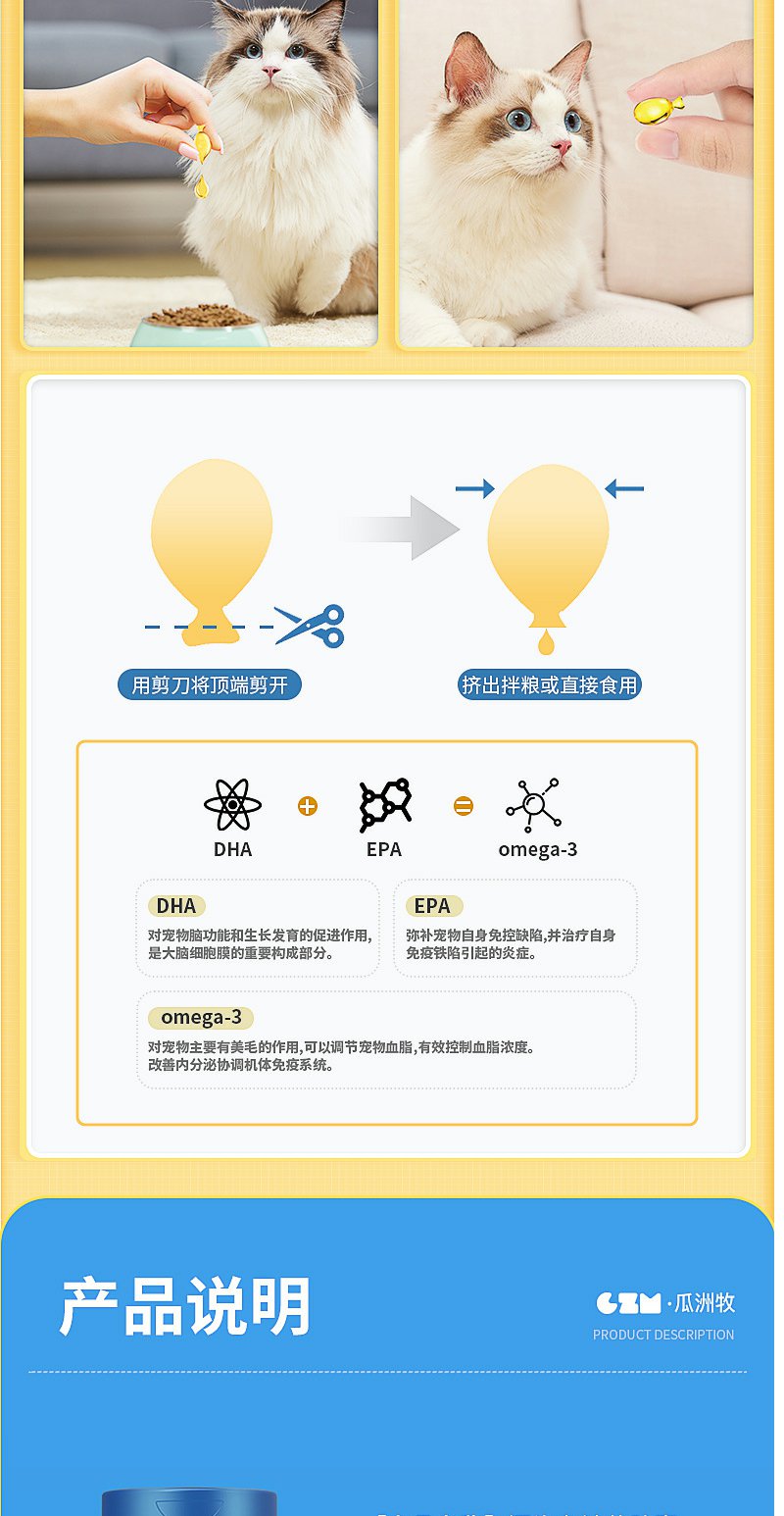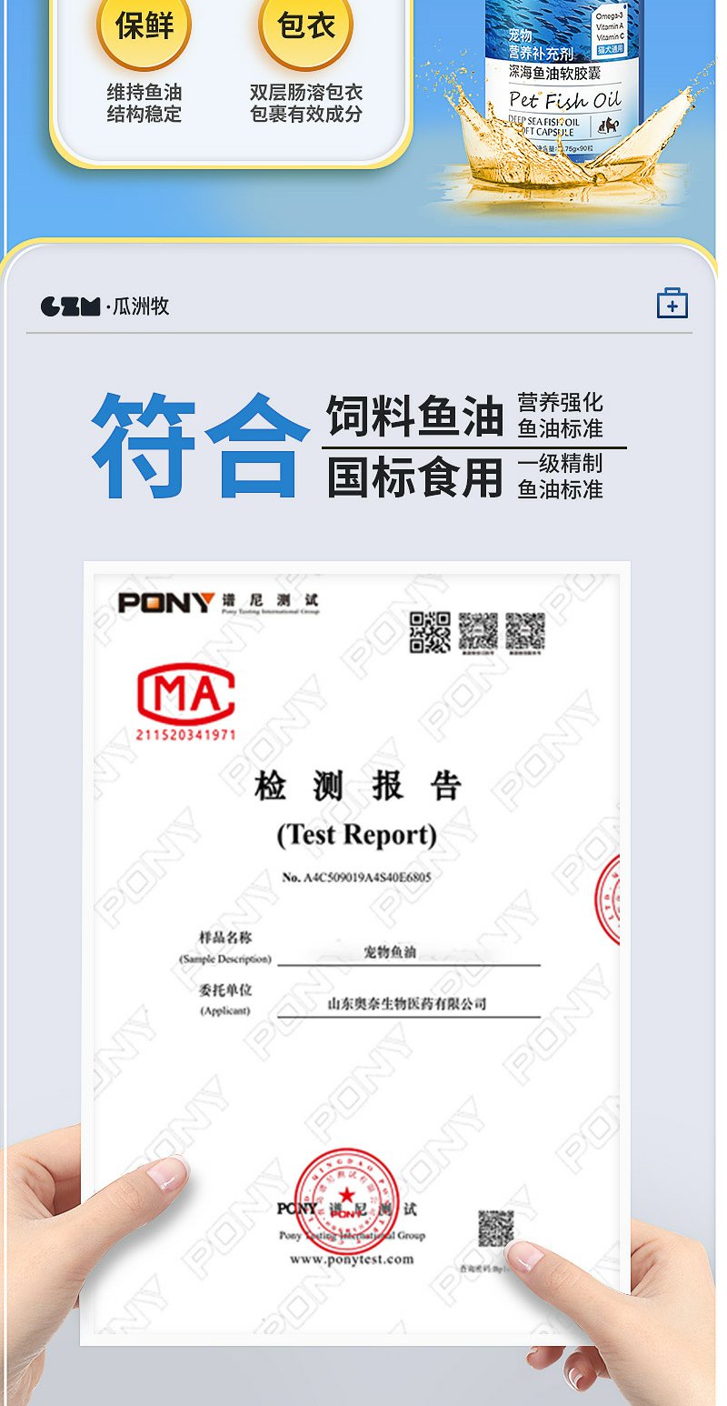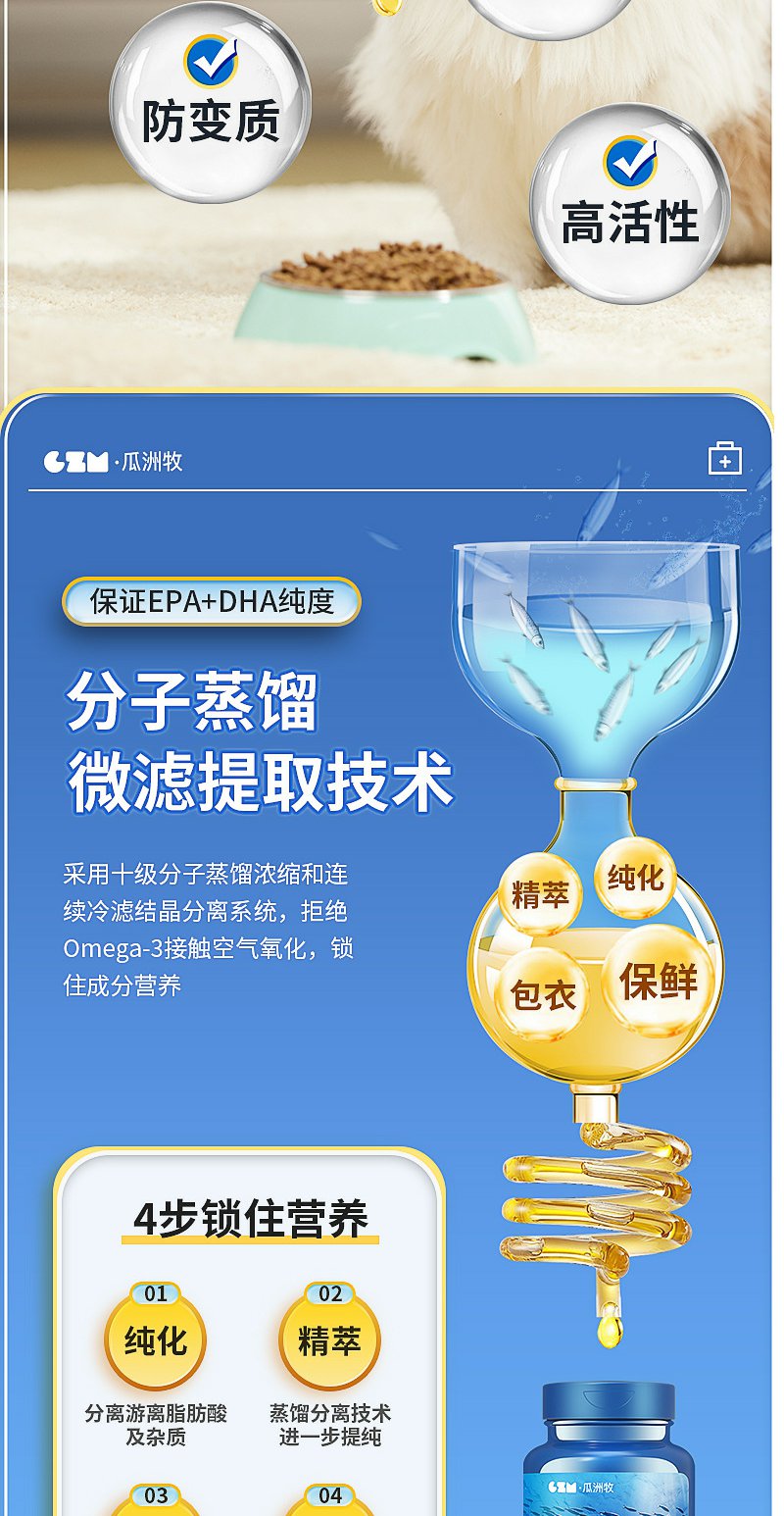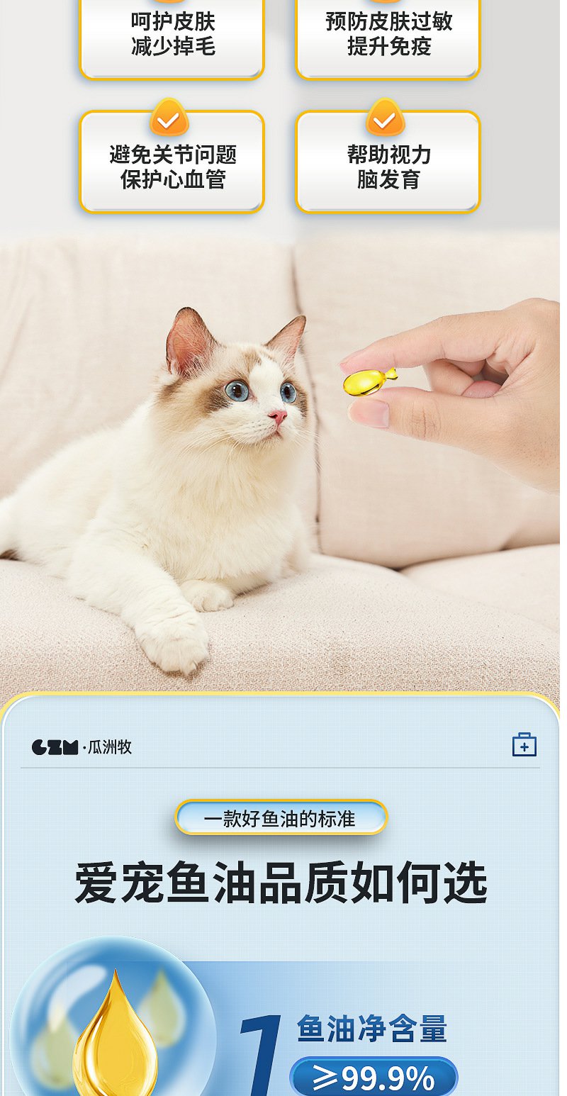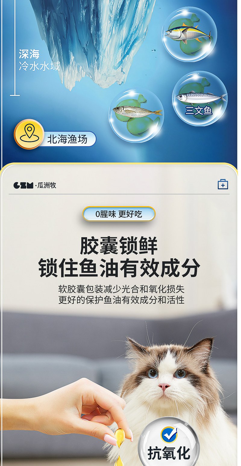 瓜洲牧【猫咪专用】深海鱼油猫猫专用美毛护肤宠物防掉毛卵磷脂胶囊鱼肝油70粒/装