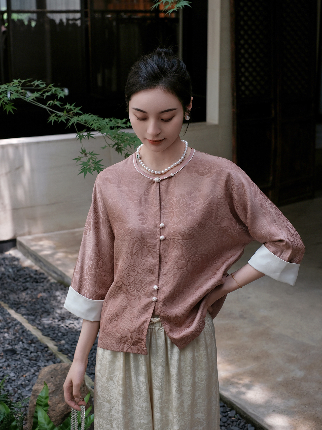 盛唐婧 |圆领团花丝麻提花宽袖上衣-白色