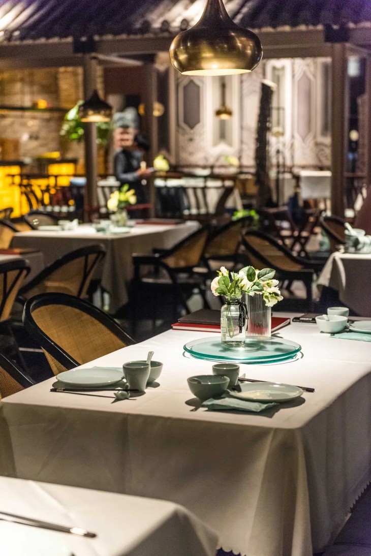 素静的洁白桌布搭配着撞色复古皮质座椅