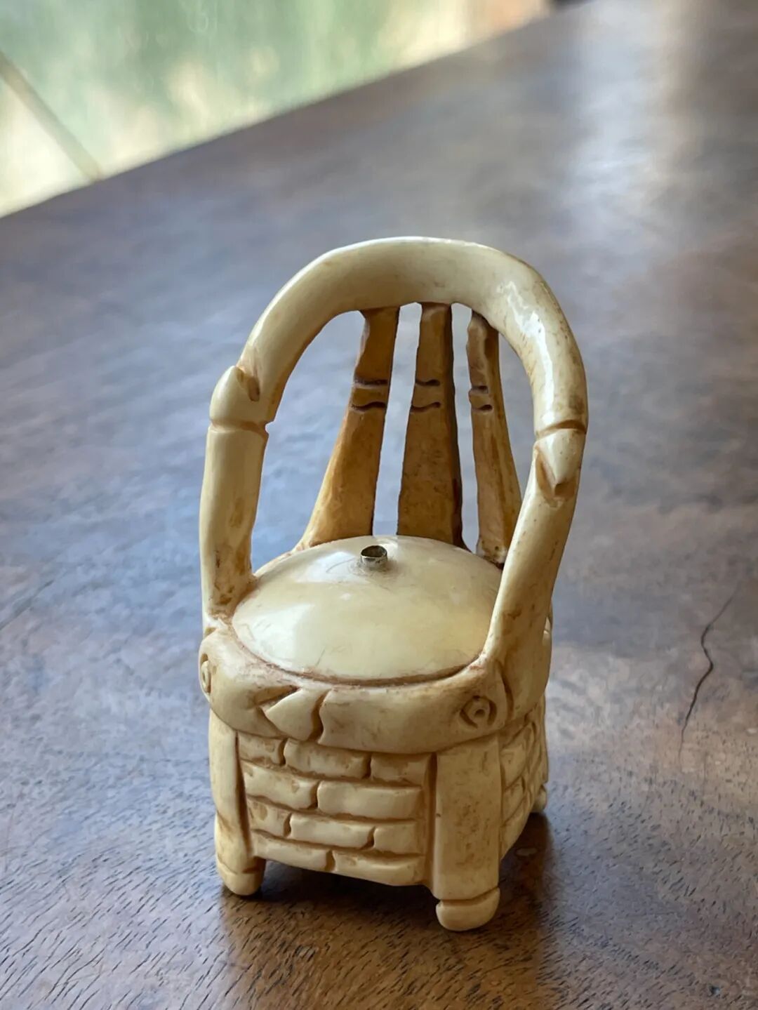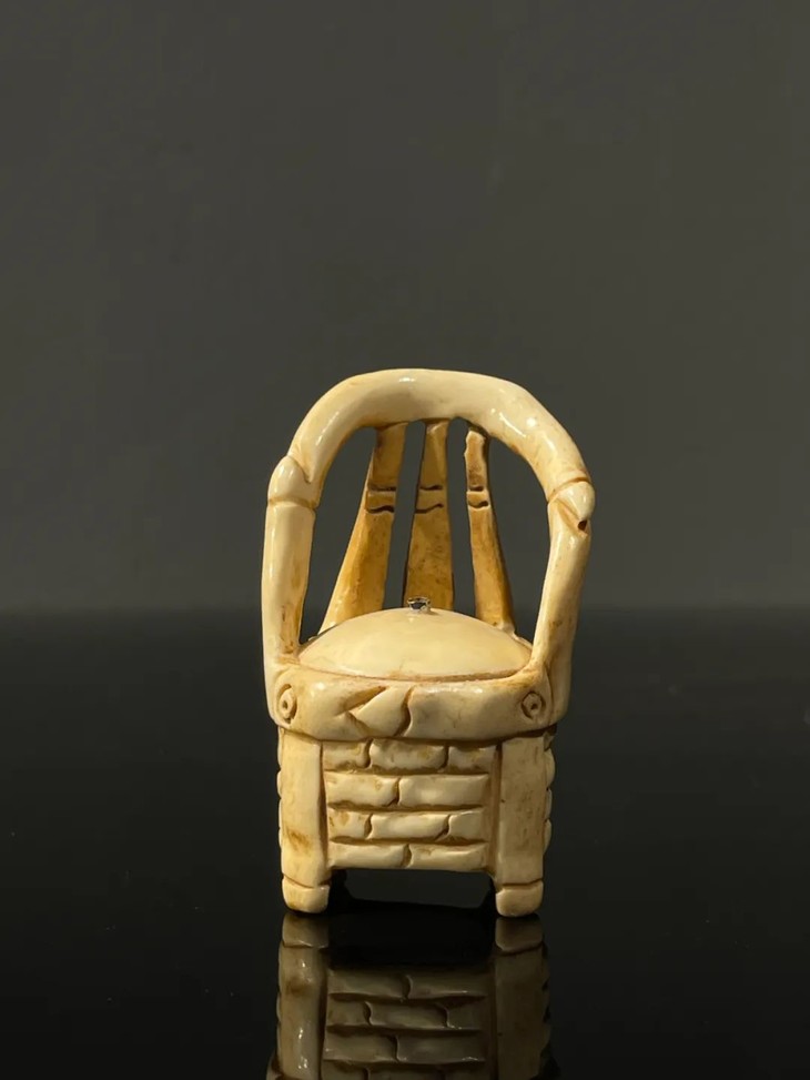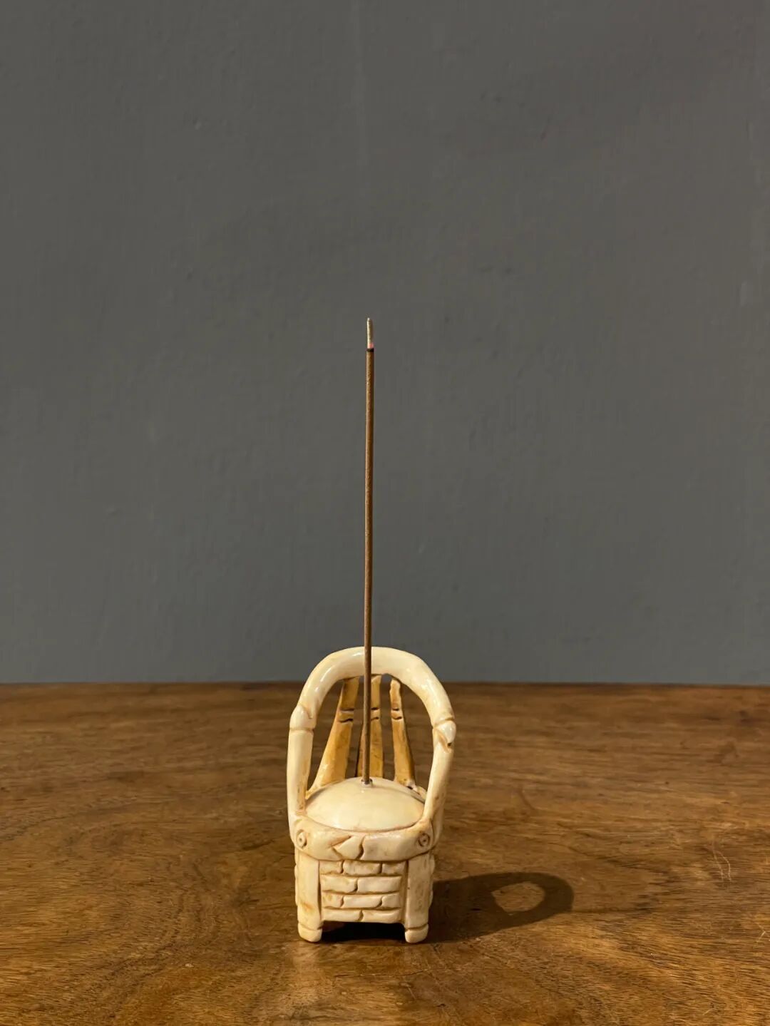 这是一件以天然牛骨镂空透雕而成的牛骨镂雕圈椅形香插,传统圈椅造形,设计精巧、做工精緻,椅子周身雕刻竹笋,寓意节节高升,椅面中间央镶嵌铜芯为插线香位置,是一件匠心独具的线香香插。