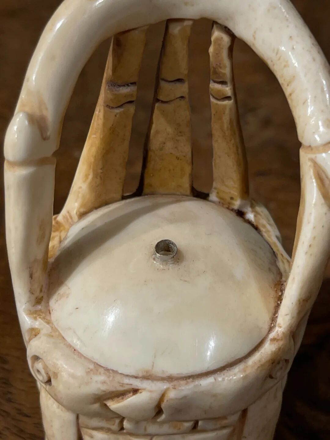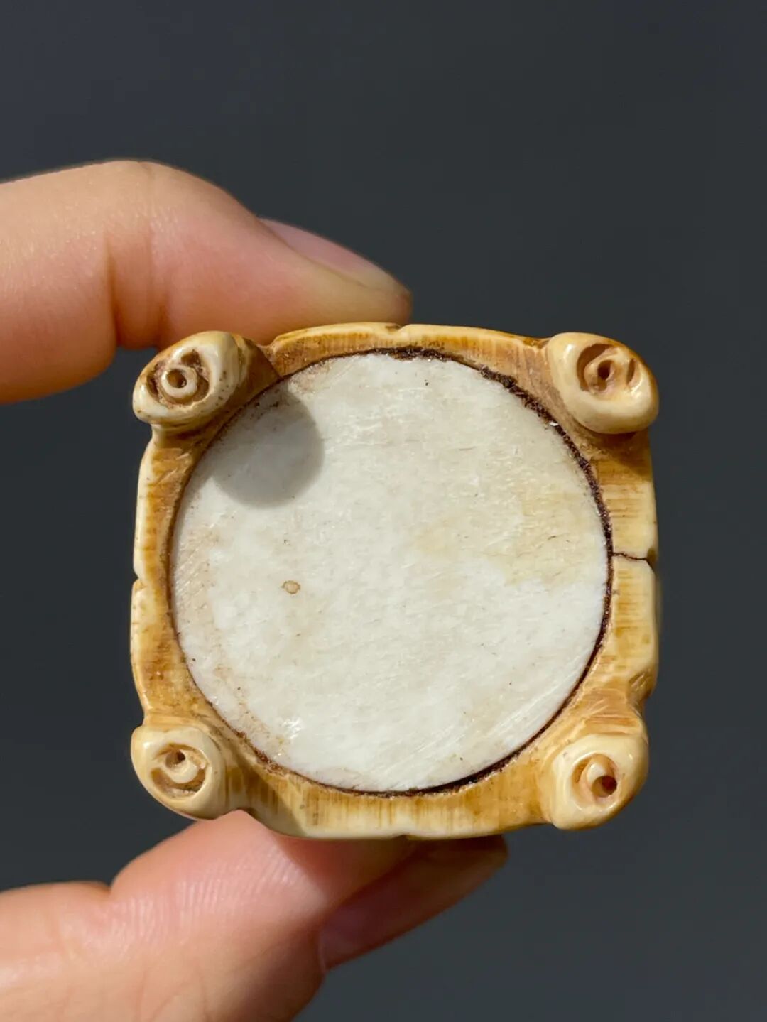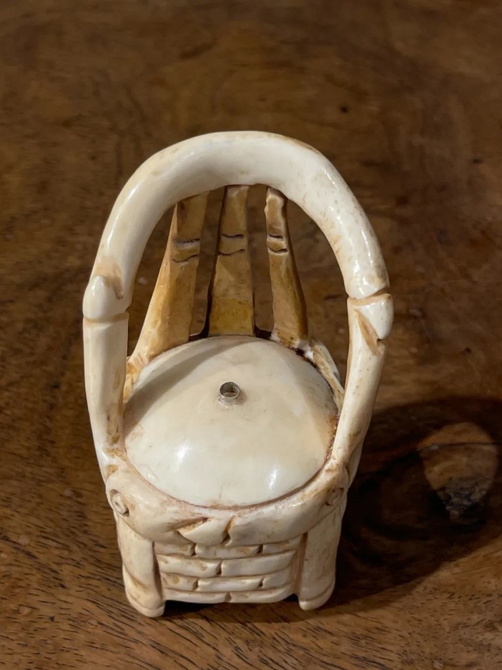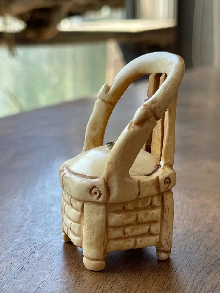 这是一件以天然牛骨镂空透雕而成的牛骨镂雕圈椅形香插,传统圈椅造形,设计精巧、做工精緻,椅子周身雕刻竹笋,寓意节节高升,椅面中间央镶嵌铜芯为插线香位置,是一件匠心独具的线香香插。