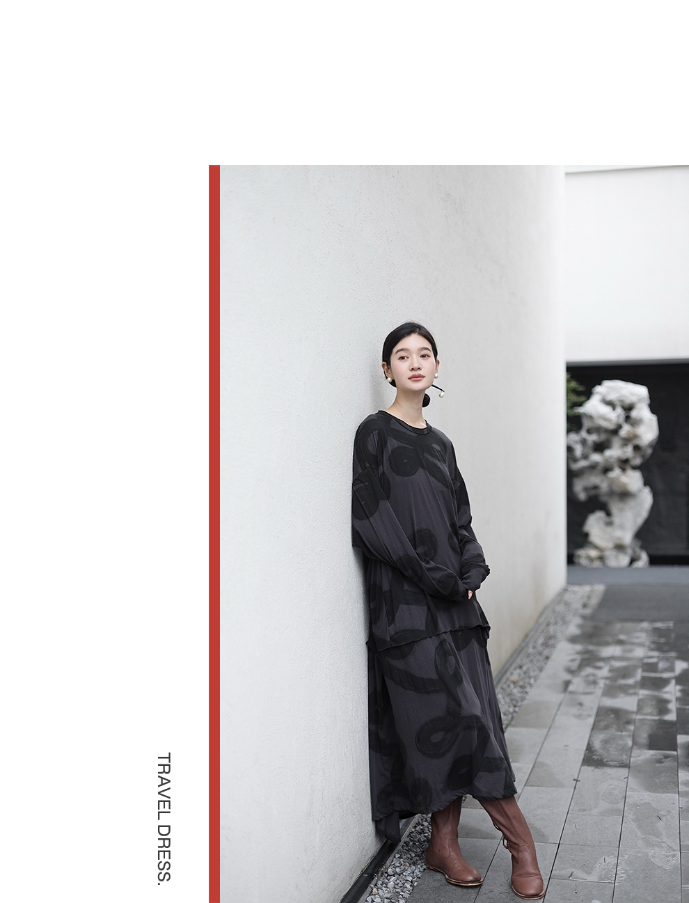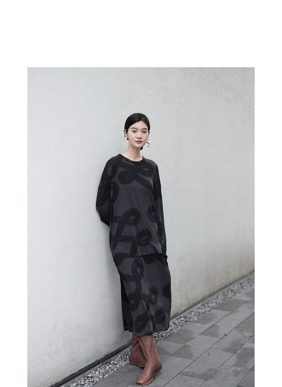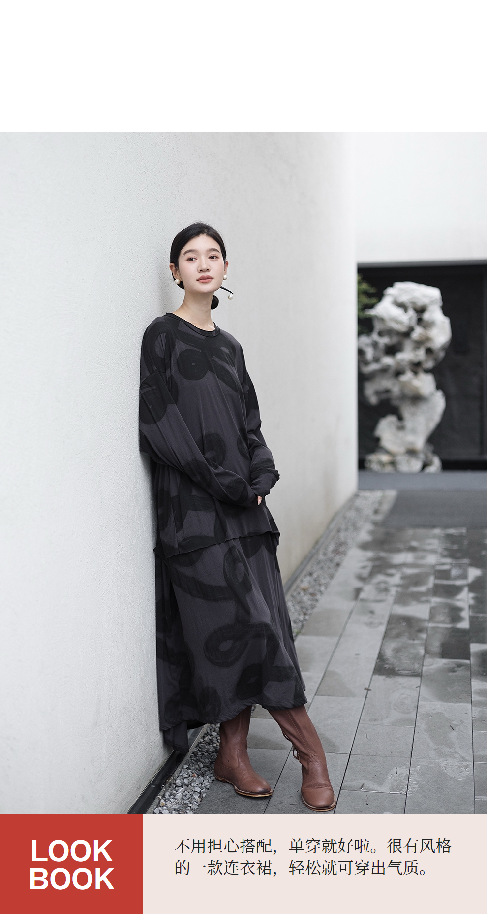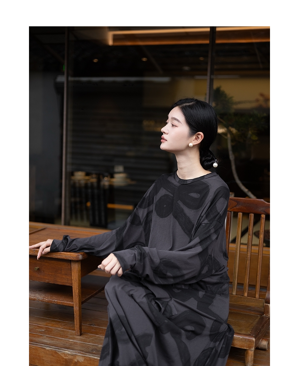 绽放女装555朵/棉针织抽象印花结构感落肩款长袖旅行连衣裙女秋季