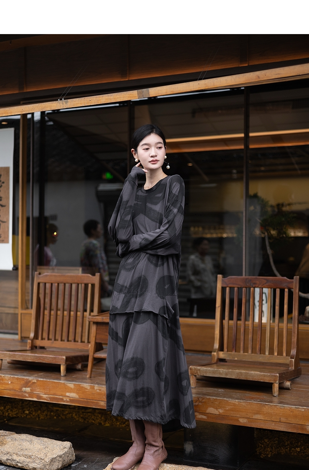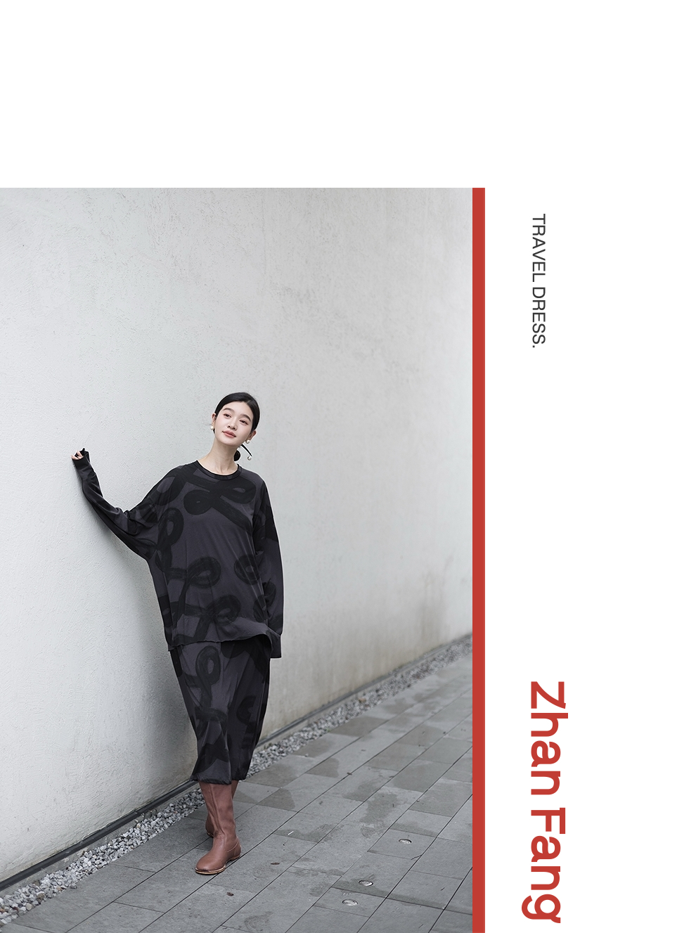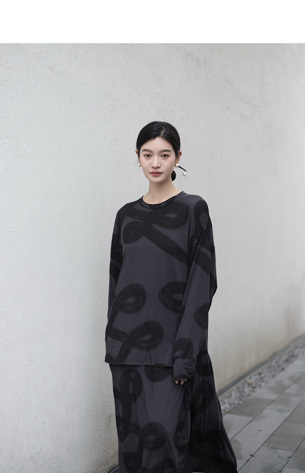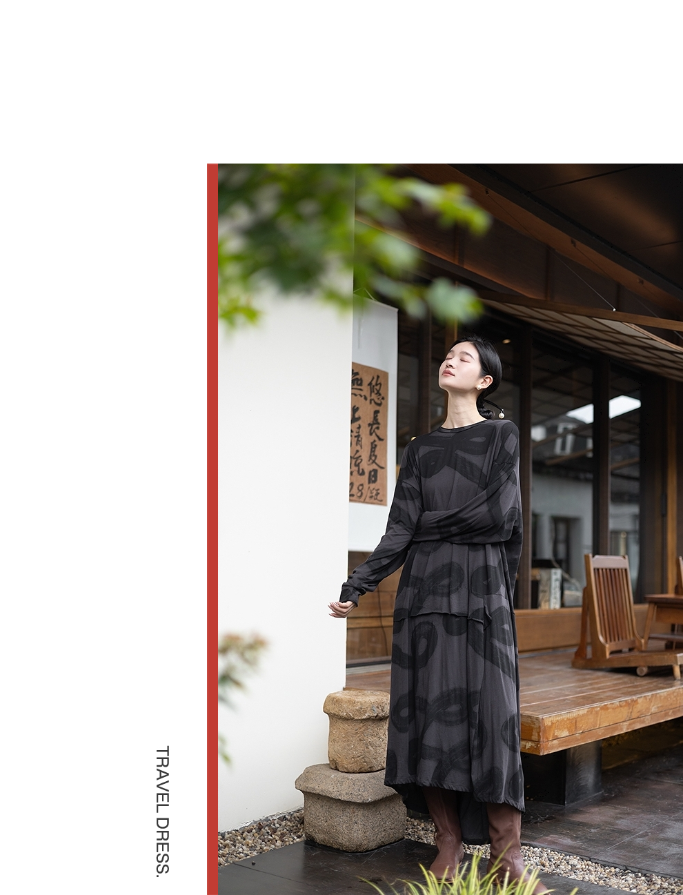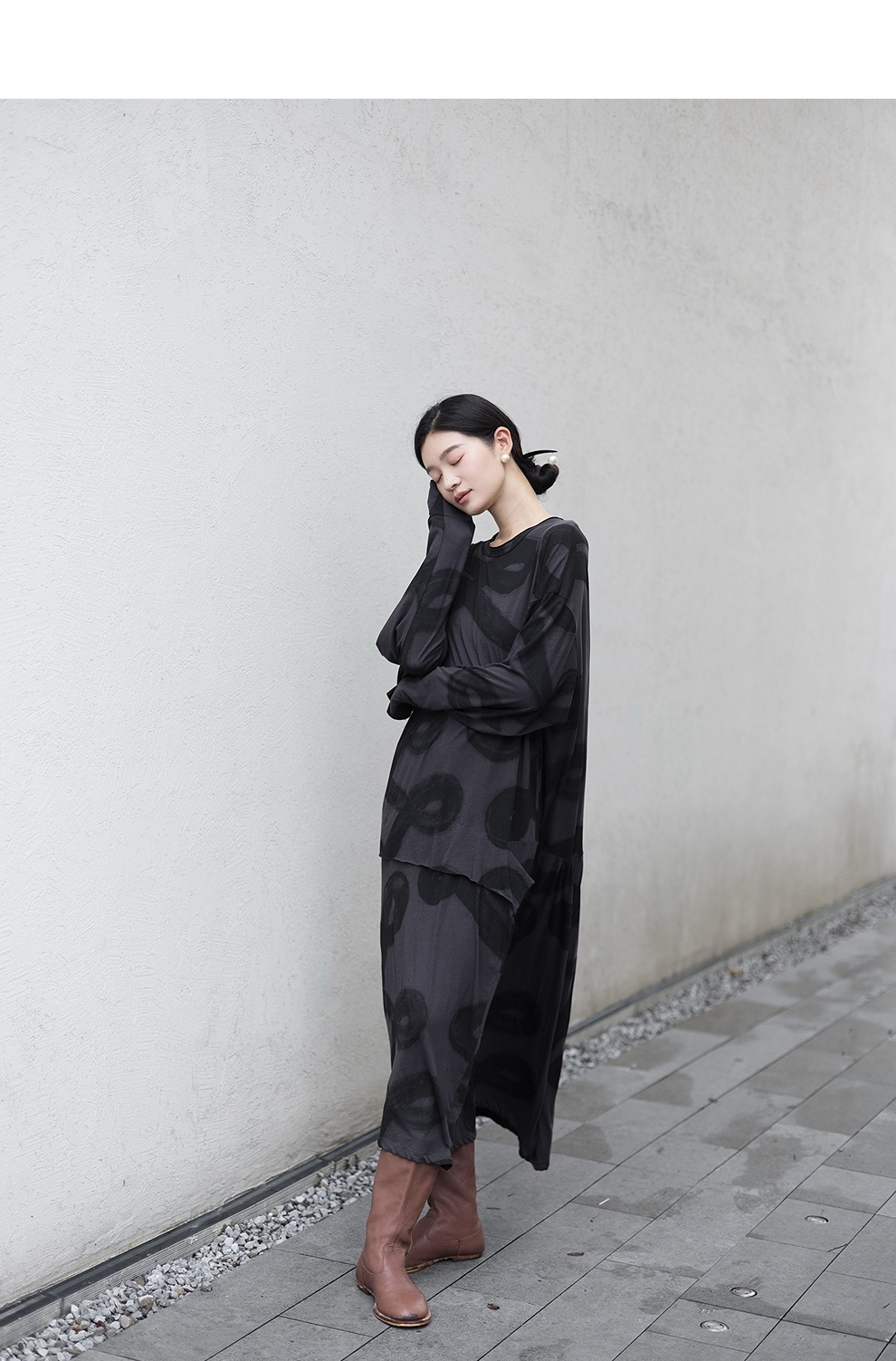 绽放女装555朵/棉针织抽象印花结构感落肩款长袖旅行连衣裙女秋季