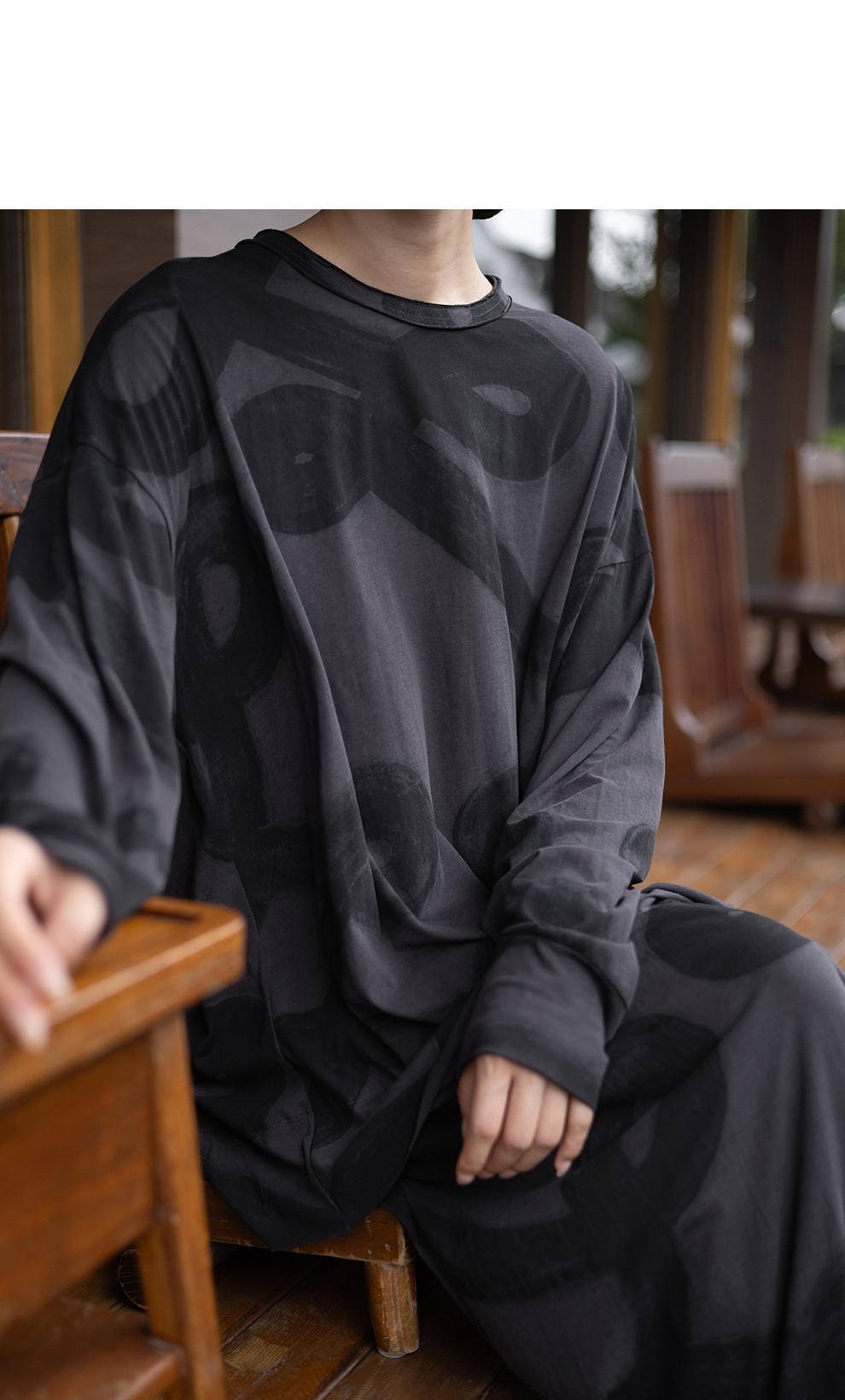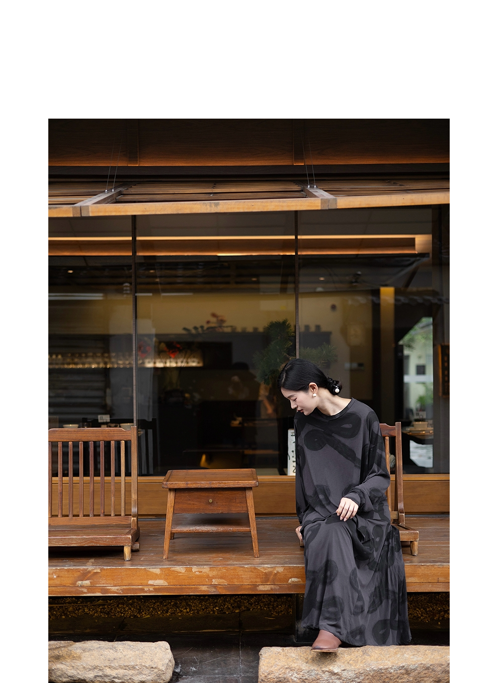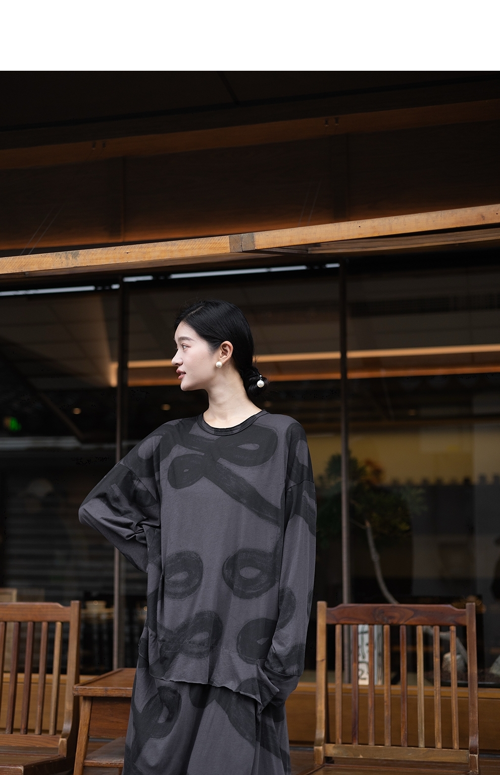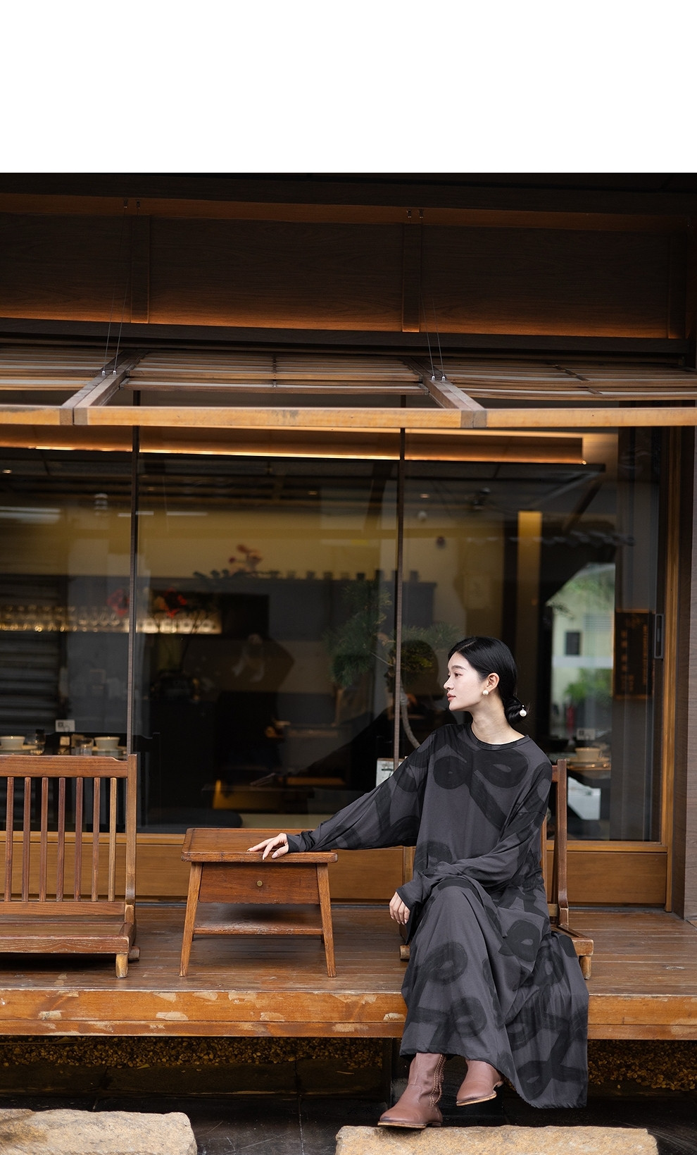 绽放女装555朵/棉针织抽象印花结构感落肩款长袖旅行连衣裙女秋季