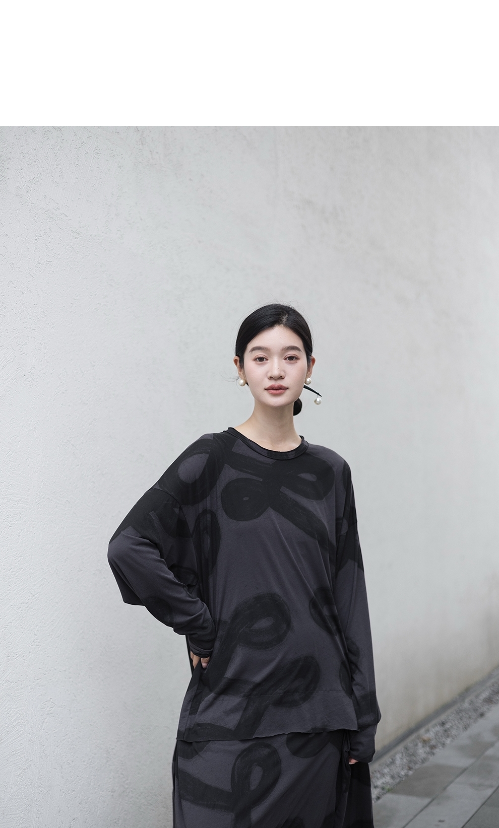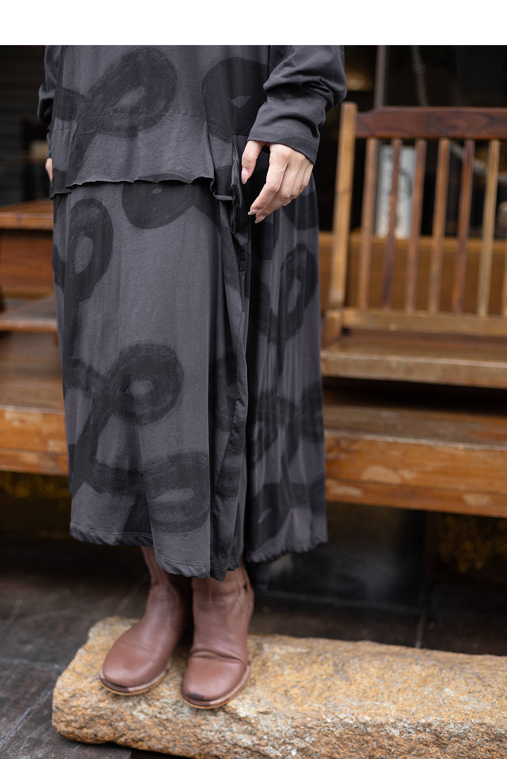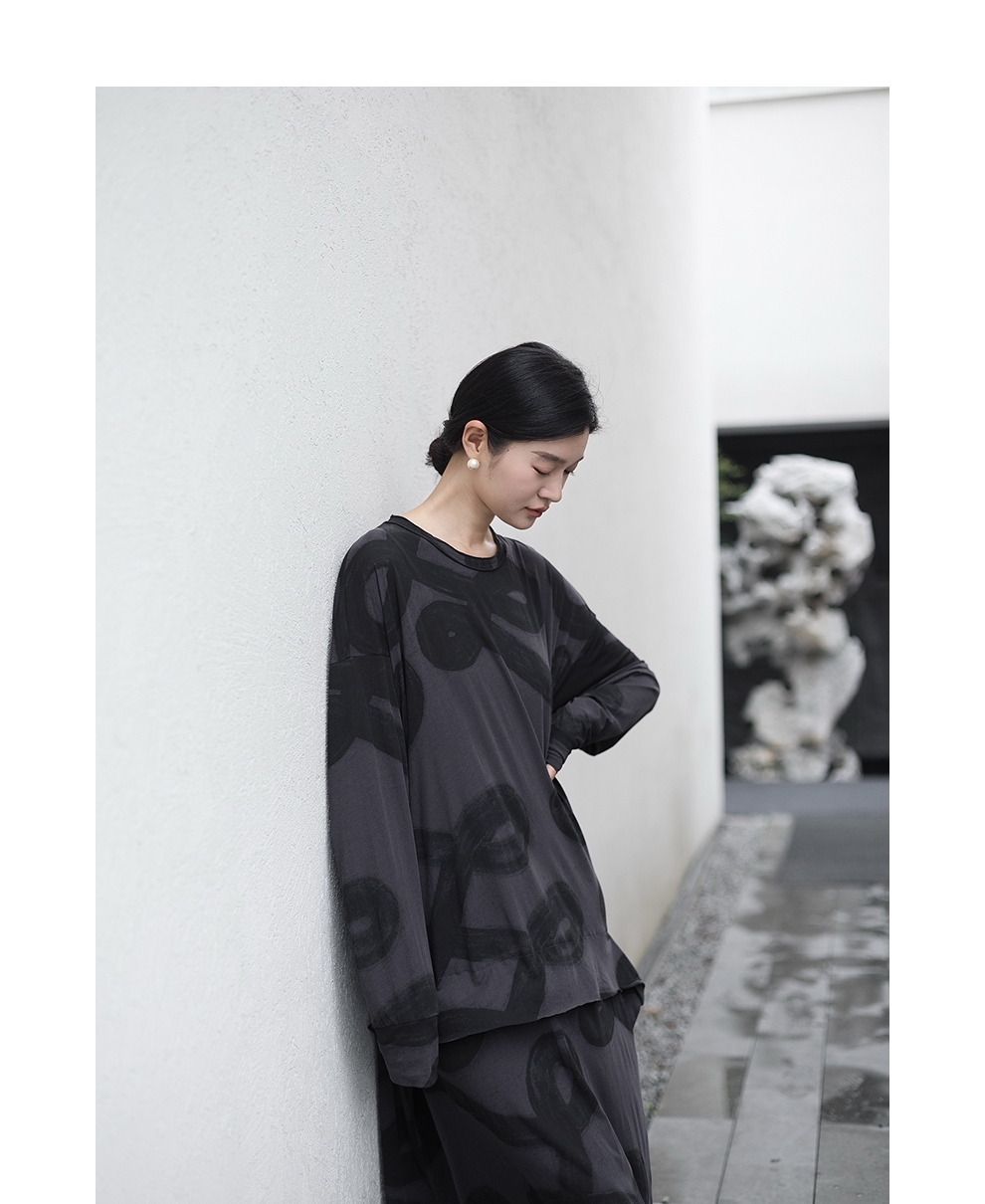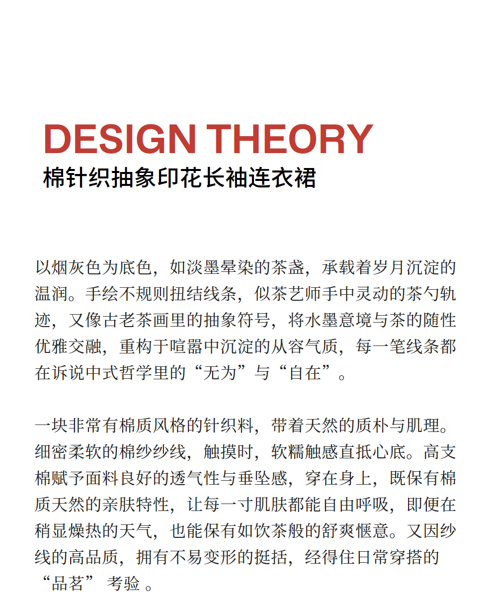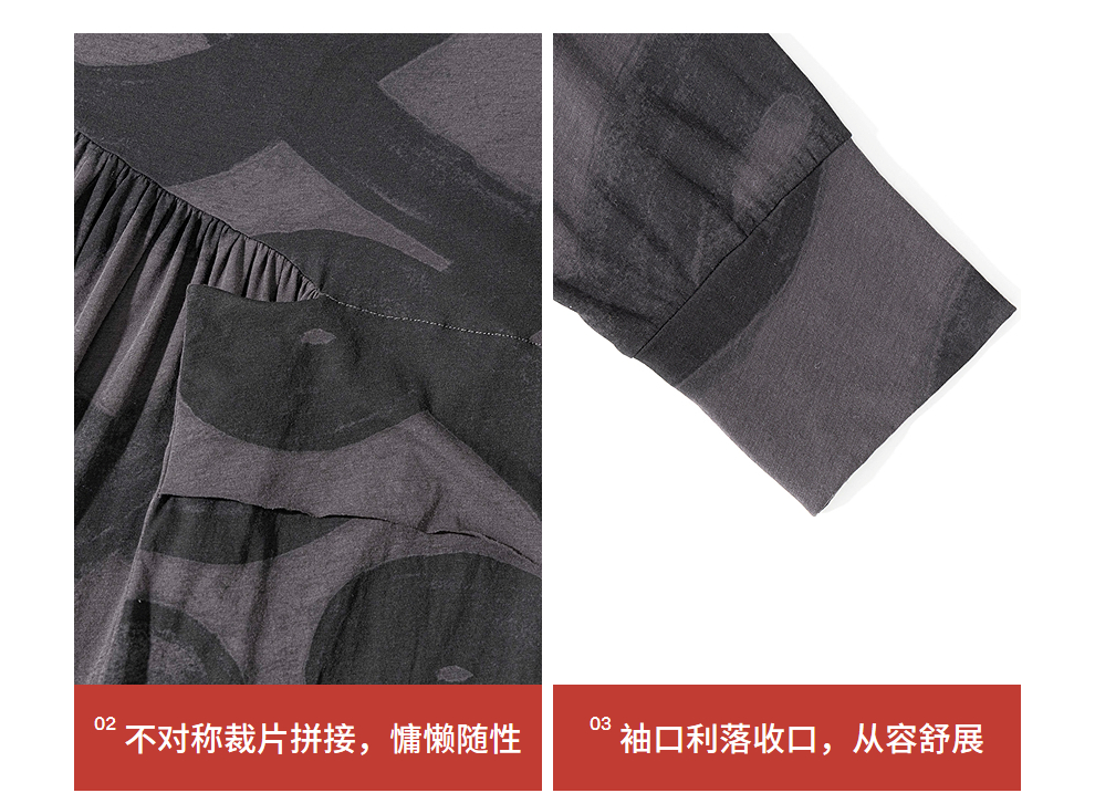 绽放女装555朵/棉针织抽象印花结构感落肩款长袖旅行连衣裙女秋季