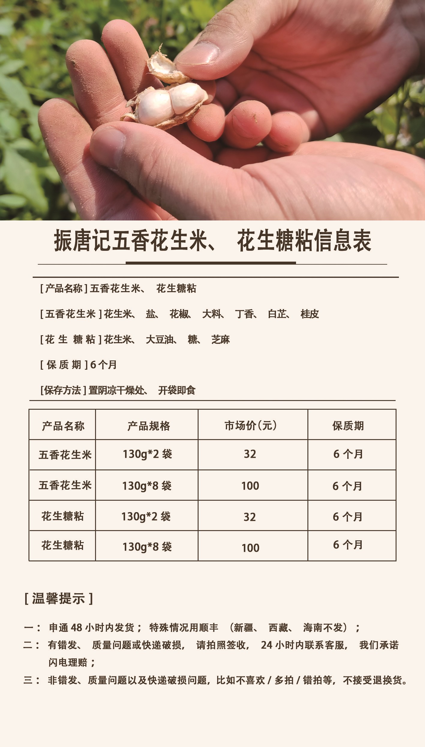 一:两种花生都抽了真空包装,但其实不抽真空也不会坏,因为花生有尖,个别触碰漏气不可避免,因漏气产生的售后,不赔不换。 二:有错发、质量问题或快递破损,请拍照签收,24小时内联系客服,我们承诺闪电理赔。