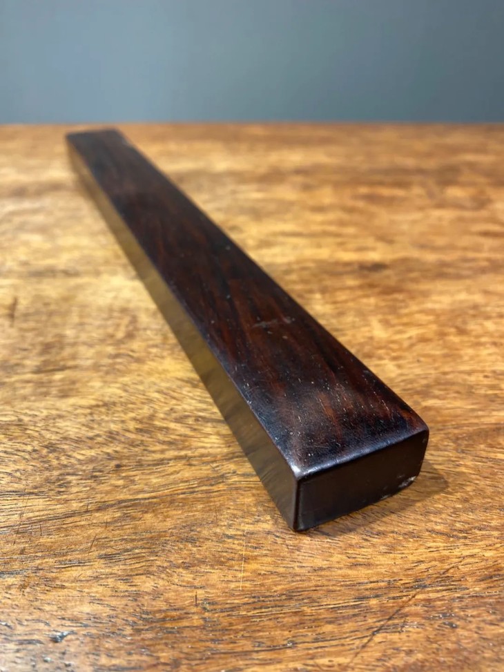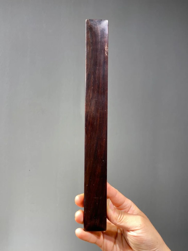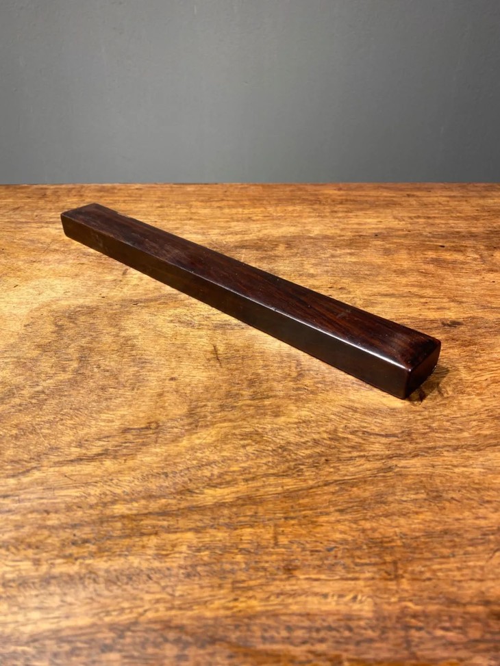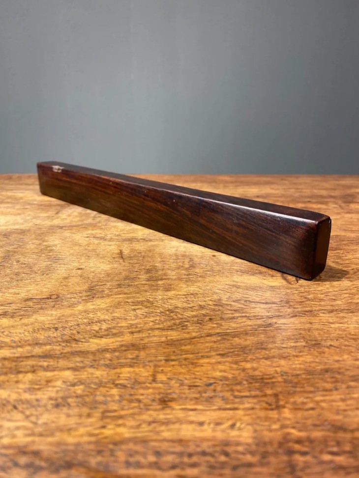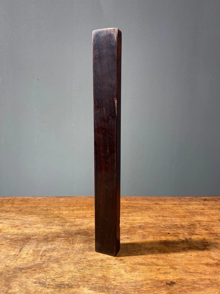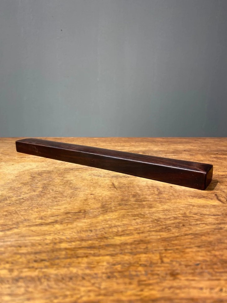 谈到旧时代用具的讲究,免不了要提起文人书房里的用具,当时的家具与文房用具,不但取材讲究,在实用性与审美的设计方面也达到了后人难以超越的高度,当时并不风行繁复的纹饰与精细的雕琢,反倒在选择原材料上非常的讲究,由铜炉用的精炼铜、砚台用的石头、以及家具与文房用具的木头,绝对是选最恰当的材质。今天我们分享的这件看似简单的大红酸枝木文房镇尺,正是典型明清文人品味与质量的书房或是富贵人家的经典用具。