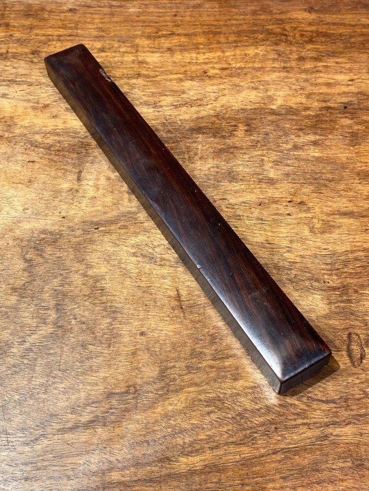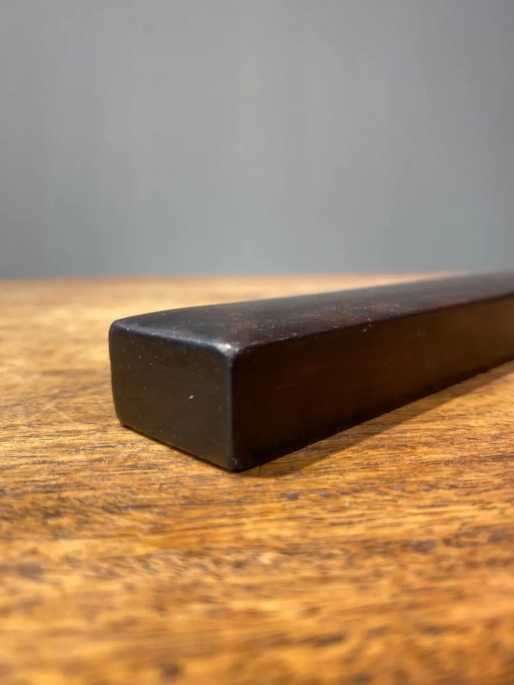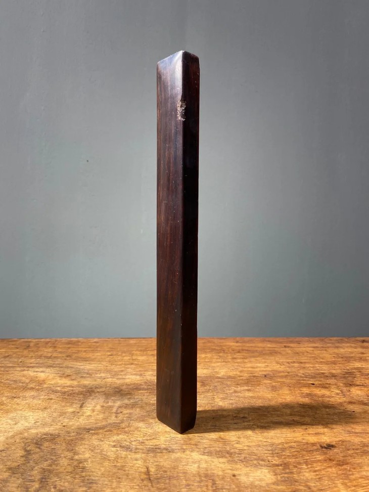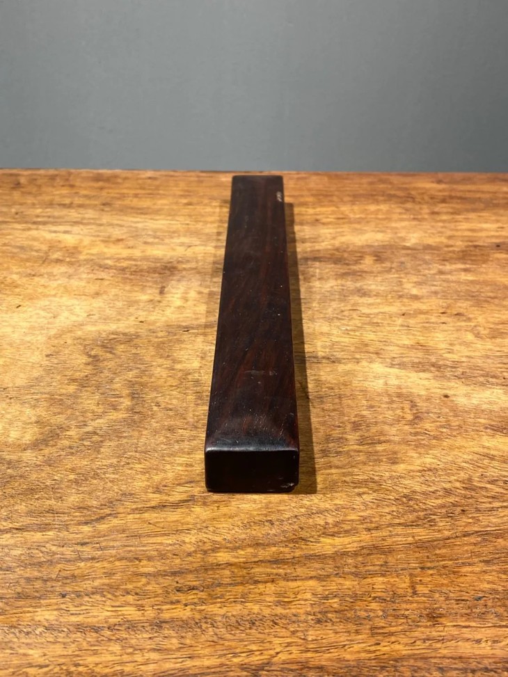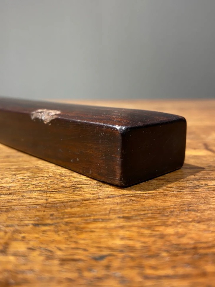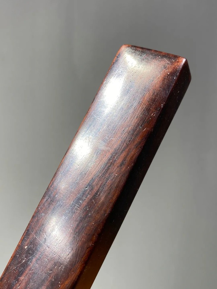 谈到旧时代用具的讲究,免不了要提起文人书房里的用具,当时的家具与文房用具,不但取材讲究,在实用性与审美的设计方面也达到了后人难以超越的高度,当时并不风行繁复的纹饰与精细的雕琢,反倒在选择原材料上非常的讲究,由铜炉用的精炼铜、砚台用的石头、以及家具与文房用具的木头,绝对是选最恰当的材质。今天我们分享的这件看似简单的大红酸枝木文房镇尺,正是典型明清文人品味与质量的书房或是富贵人家的经典用具。