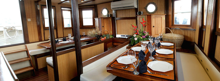 Raja Laut在当地意为 "King of the Sea",是一艘典型的印尼木质帆船。可容纳12名潜水员,共有3间双人房,3间大床房,每一间房间均含有空调和独立卫生间,适合小团队出游。