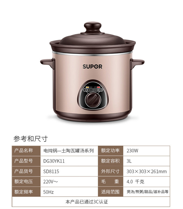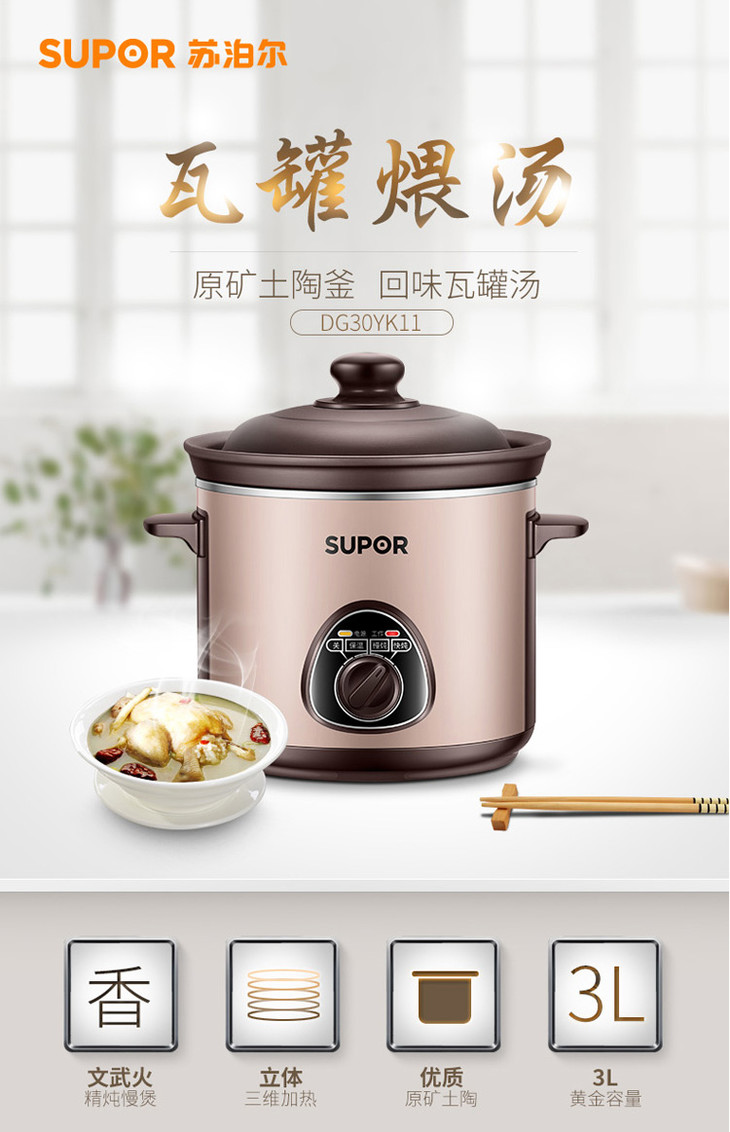 苏泊尔(SUPOR)电炖锅DG30YK11单胆砂锅炖盅煮粥煲汤养生锅炽陶 内胆3L容量