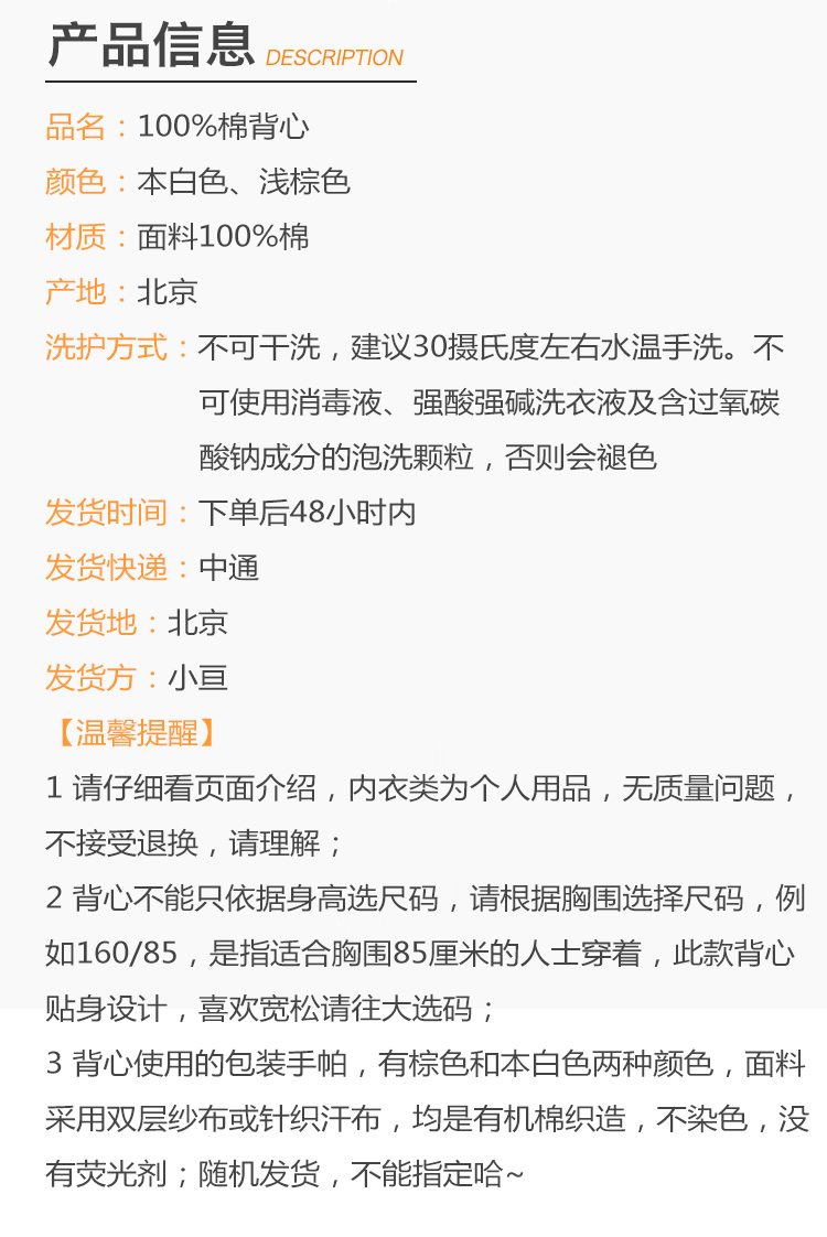 小亘纯棉背心 打底内衣 本白色【贴身衣物非质量问题不支持退换、常规地区满120包邮】