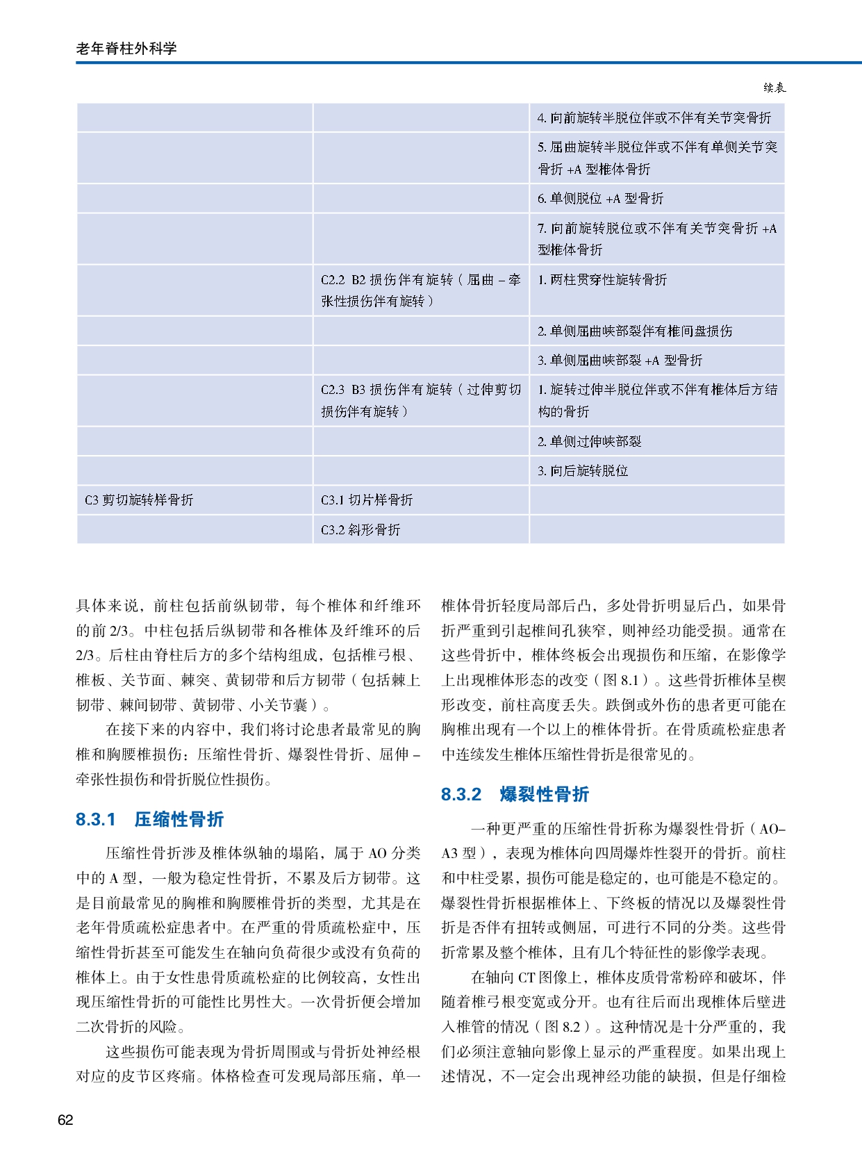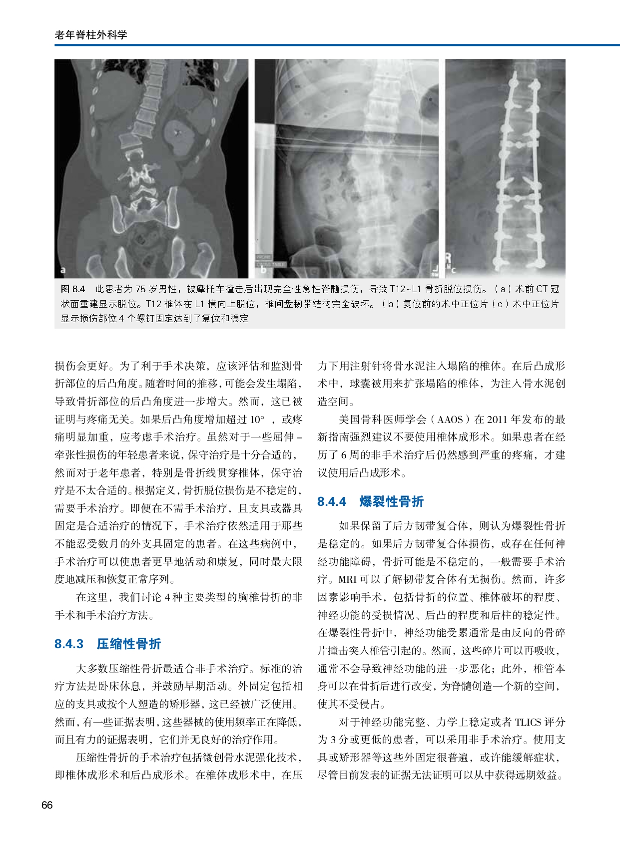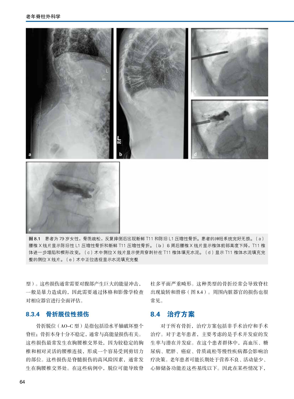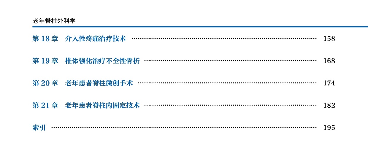本书通过 21 个章节围绕老年脊柱疾病患者的重点、难点及热点进行了阐述,其中第 1、2 章介绍了老年患者的临床评估及老年脊柱疾病的临床特点,主要阐述了老年脊柱疾病患者的流行病学及衰老对脊柱解剖结构的影响。 第 3、4 章介绍了老年骨质疏松症的诊断与治疗及老年脊柱疾病患者的手术决策。第5、6 章介绍了老年脊柱疾病患者的常见并发症的研究概况及围手术期的护理。第7、16 章介绍了常见脊柱退行性疾病的病理变化、临床特点及诊断依据,包括颈椎骨折、胸椎及胸腰段骨折、腰椎骨折、脊髓损伤及中央管综合征、颈椎畸形、腰椎管狭窄症、腰椎退行性滑脱症、脊柱退行性侧凸等方面。第17、21 章介绍了老年脊柱病的手术和非手术治疗选择,主要围绕非手术的疼痛管理、介入性的疼痛治疗、椎体强化术、微创手术、开放内固定等方面进行了阐述。本书将为临床治疗老年脊柱疾病提供参考。书中也配有丰富的插图,以便对这些主题的研究有进一步的了解,使读者一目了然。