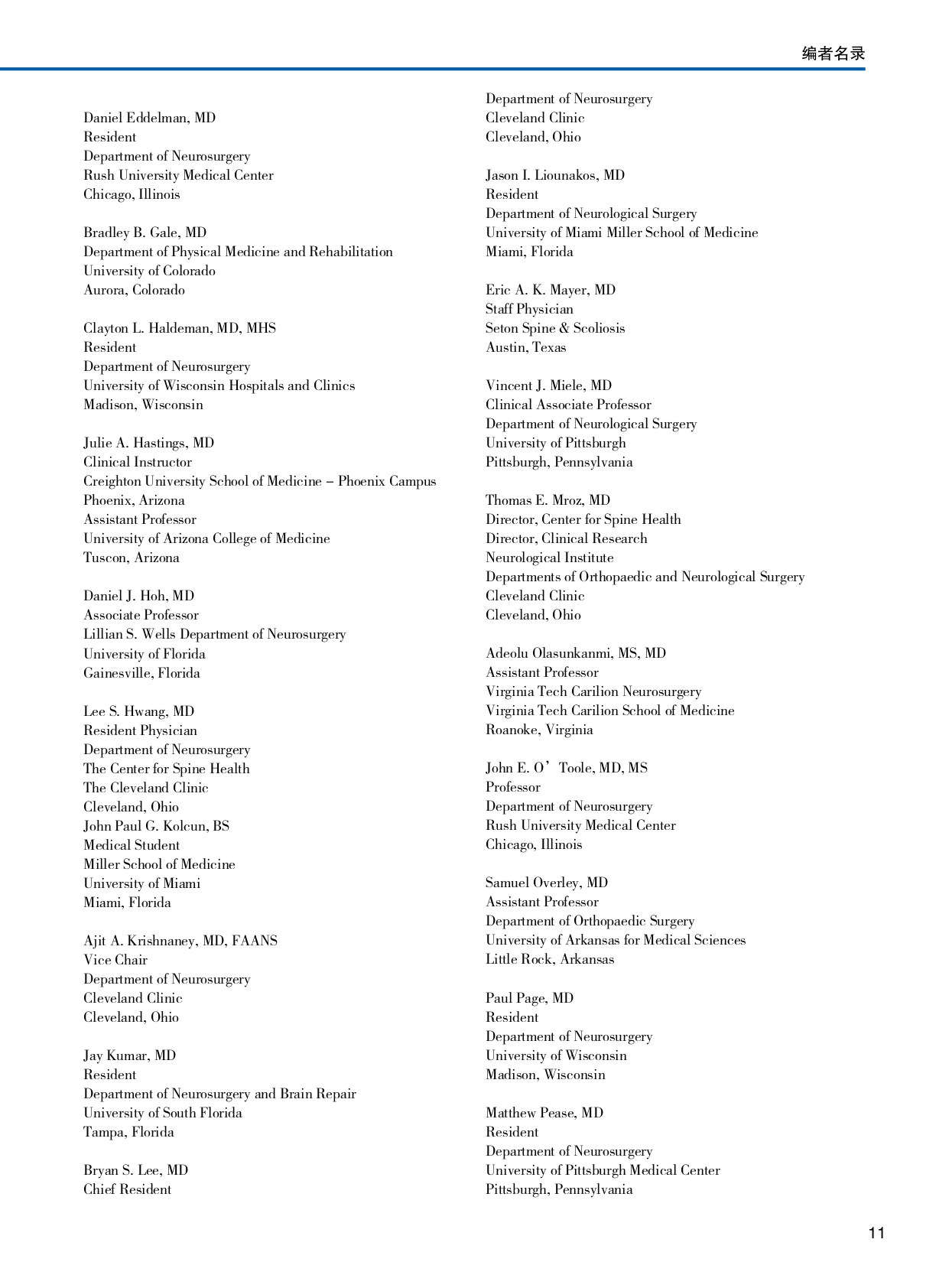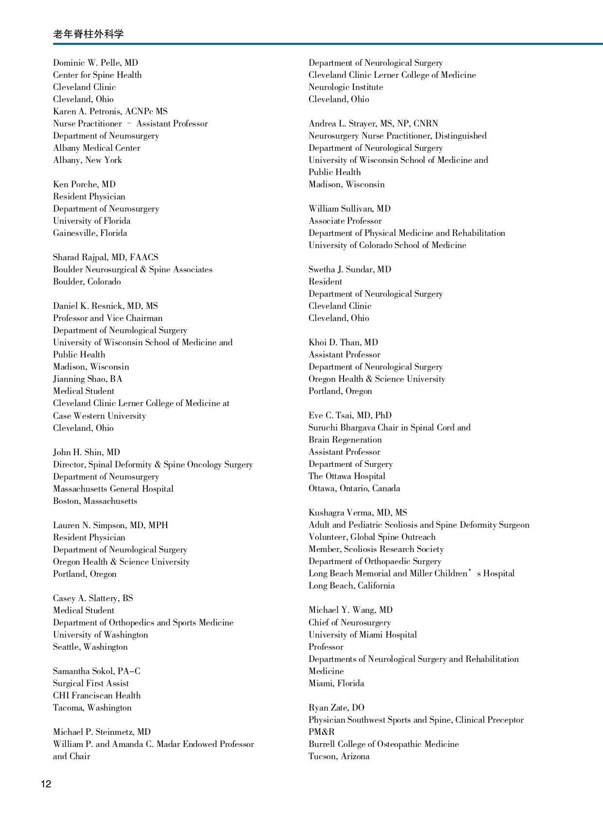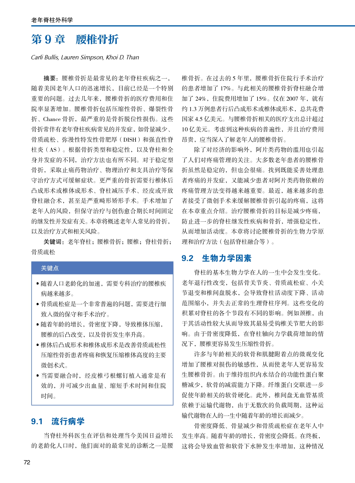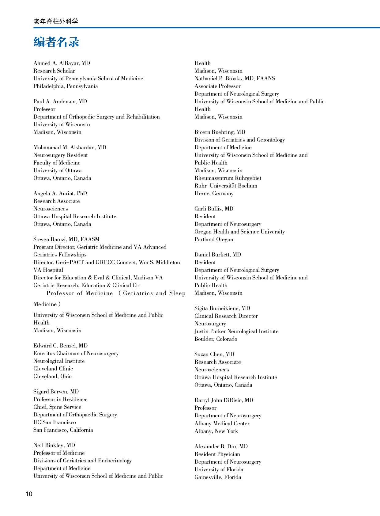 本书通过 21 个章节围绕老年脊柱疾病患者的重点、难点及热点进行了阐述,其中第 1、2 章介绍了老年患者的临床评估及老年脊柱疾病的临床特点,主要阐述了老年脊柱疾病患者的流行病学及衰老对脊柱解剖结构的影响。 第 3、4 章介绍了老年骨质疏松症的诊断与治疗及老年脊柱疾病患者的手术决策。第5、6 章介绍了老年脊柱疾病患者的常见并发症的研究概况及围手术期的护理。第7、16 章介绍了常见脊柱退行性疾病的病理变化、临床特点及诊断依据,包括颈椎骨折、胸椎及胸腰段骨折、腰椎骨折、脊髓损伤及中央管综合征、颈椎畸形、腰椎管狭窄症、腰椎退行性滑脱症、脊柱退行性侧凸等方面。第17、21 章介绍了老年脊柱病的手术和非手术治疗选择,主要围绕非手术的疼痛管理、介入性的疼痛治疗、椎体强化术、微创手术、开放内固定等方面进行了阐述。本书将为临床治疗老年脊柱疾病提供参考。书中也配有丰富的插图,以便对这些主题的研究有进一步的了解,使读者一目了然。