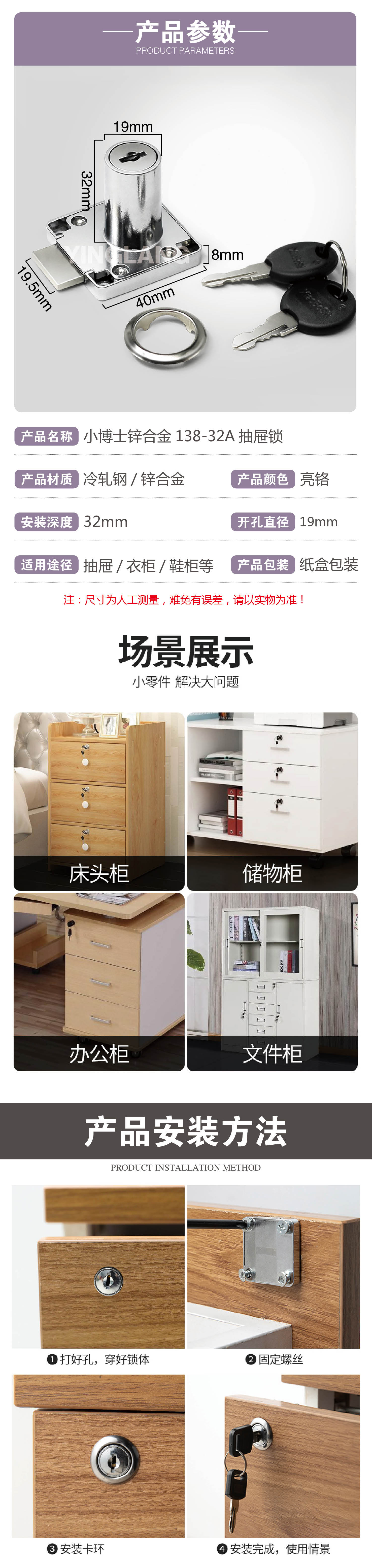 〖A208〗小博士锌合金138-32A抽屉锁