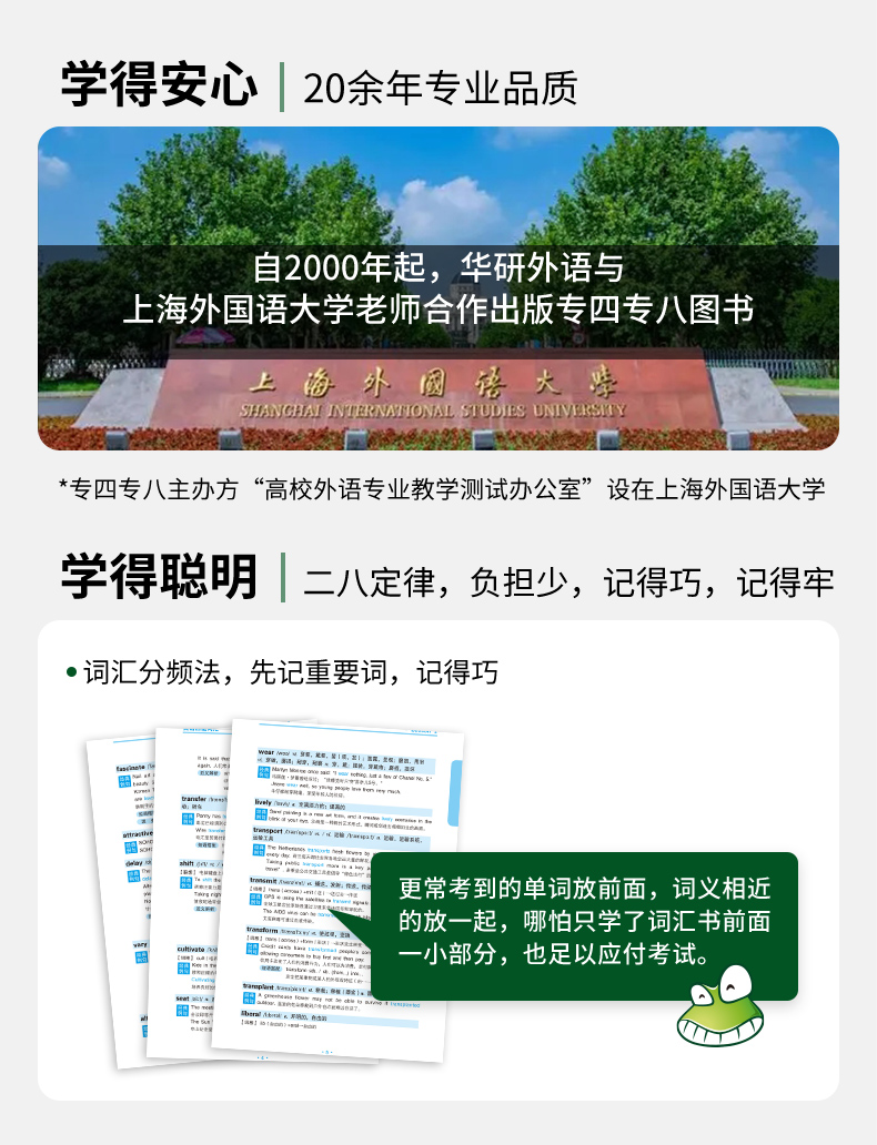 华研提倡“淘金式学习法”,通过语料库分析、词汇分频、分类分级、模板归纳等诸多手段,帮助学习者在基础阶段筛选出有价值的信息,建立个人知识体系,确定学习重点,减少不必要的学习负担。通过这种“沙里淘金”的方法,学习者用20%的精力就能取得80%的成效,快速进步,实现目标。