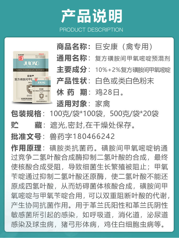 【巨安康】禽用水溶复方磺胺间甲氧嘧啶100g/500g