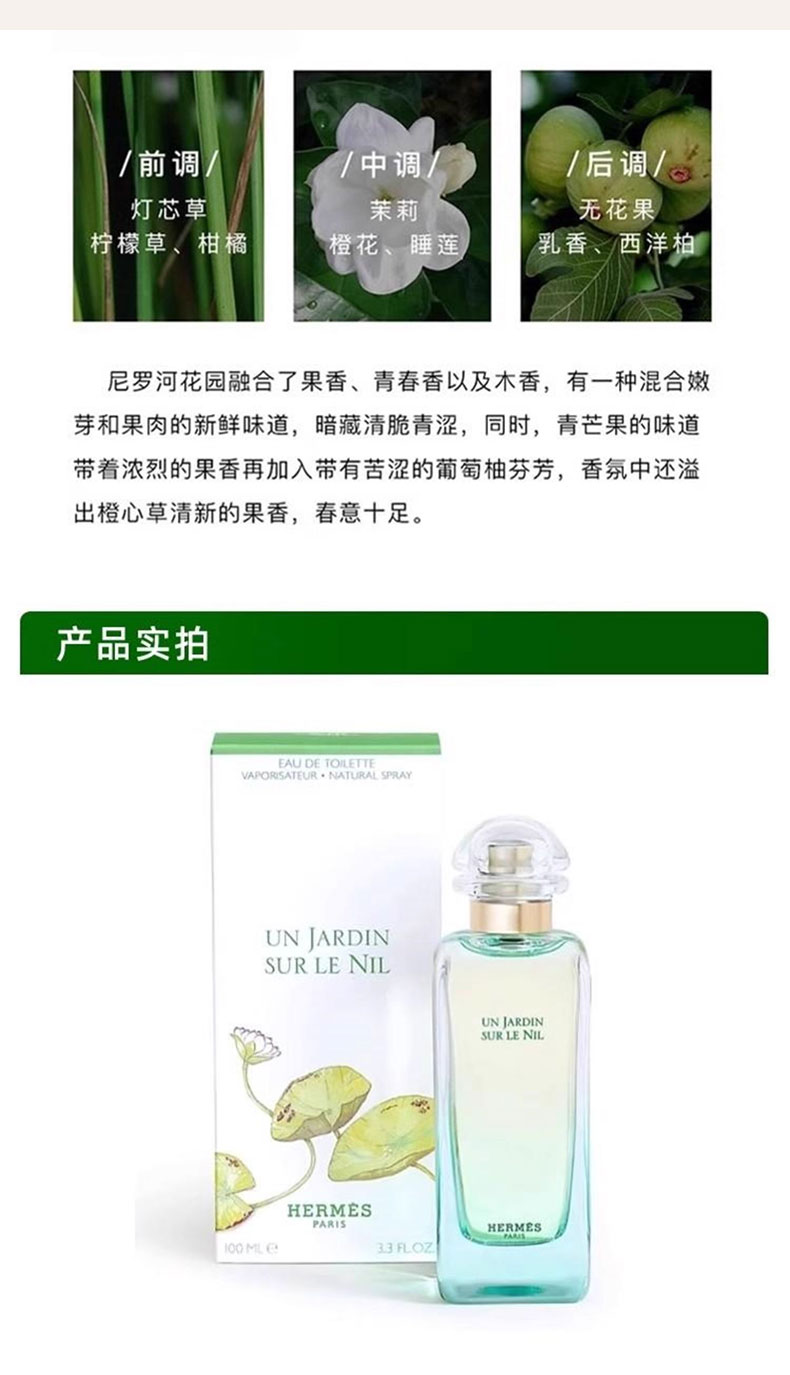 【品牌】 爱马仕 HERMES 【商品名称】 :法国 爱马仕 HERMES 尼罗河花园女士淡香水 100ml 【规格】:100ml 【产地】:法国 (以实际收到为准) 【批次/限用日期】:有效期27年1月 【注!!!】批次更新较快,具体以实收批次日期为准 【版本】:免税版 【包装方式】:单独 无塑封 【快递】:韵达快递 【发货地】:香港 【运费模板】: 新疆,宁夏,内蒙古,甘肃+5,其他地区包邮 【不发货地区】:港澳台 西藏 【发货时效】:72小时 【售后政策】:支持七天无理由退换(不影响二次销售的基础上) |