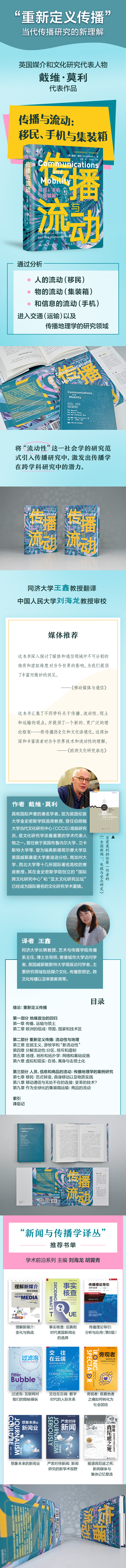 英国媒介和文化研究代表人物戴维•莫利通过这本《传播与流动》“重新定义传播”,旨在超越以往“媒体中心主义”研究范式——专注于信息传播的符号、制度和技术维度的中介形式,把传播等同于象征性或修辞性的交流,而通过分析人的流动(移民)、物的流动(集装箱)和信息的流动(手机),进入交通(运输)以及传播地理学的研究领域。作者还将“流动性”这一社会学的研究范式引入传播研究中,激发出传播学在跨学科研究中的潜力。总体上, 本书超越了学科、技术和地域的传统界限,为读者提供了对当代传播研究的新理解。