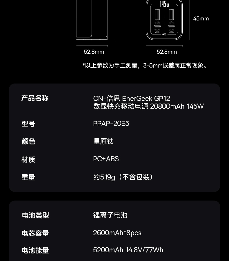 倍思 EnerGeek GP12 数显快充移动电源 20800mAh 145W