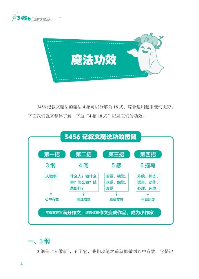 3456 记叙文魔法 4 招又可以变化出 18 式,就像是记叙文的十八般武艺,掌握后可过关斩将,无论遇到什么难题都能通行无阻。对付一般作文,你只需使出相应招式就能得到高分,不需要火力全开使出浑身解数。4 招 18 式确保你武功盖世,天下无敌。