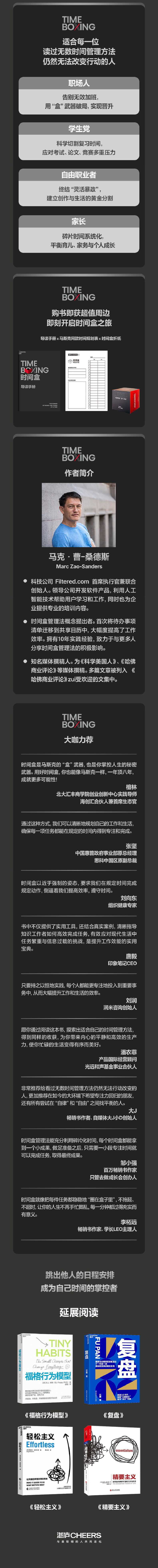 30多年来,我一直努力优化我的工作和生活。我以为自己已经做得很不错了。然而,当我读到《时间盒》这本书时,它的影响立.竿见.影,极.为深刻。如今,我每天早上都会践行时间盒管理法,这个新习惯让我达到了一种新的专注、平和与高效的状态。如果我的斯坦福学生今年只能读一本书,我希望是《时间盒》。