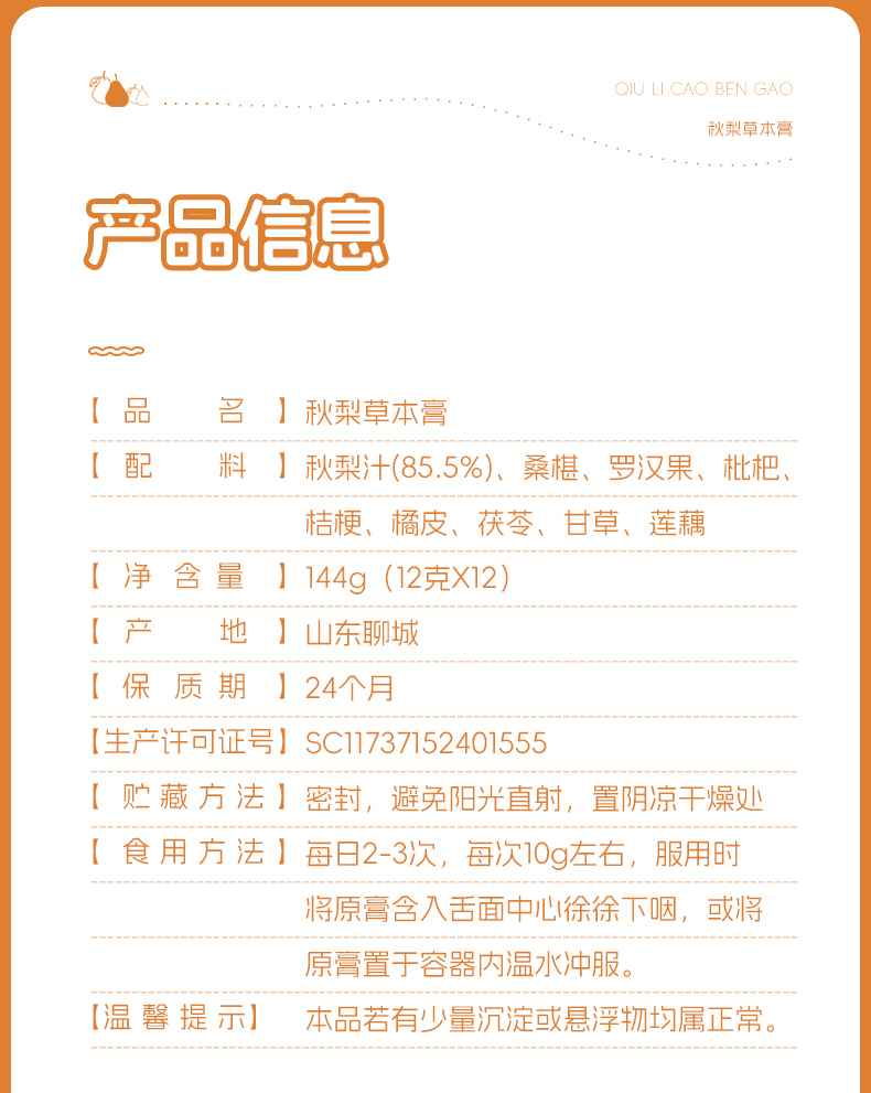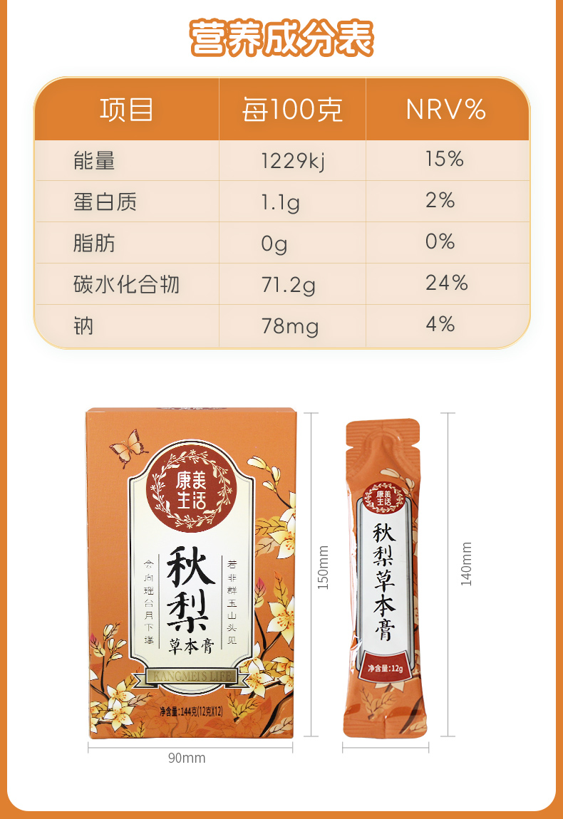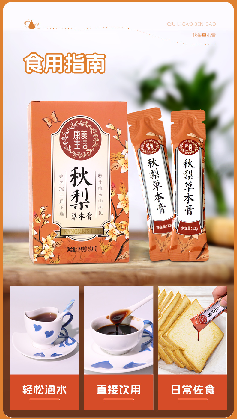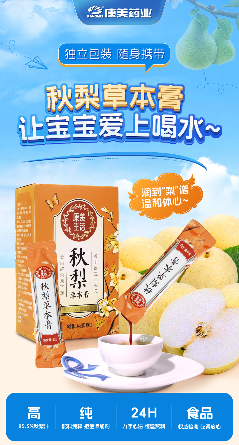 康美秋梨膏 雪梨草本膏枇杷梨膏甘草枇杷膏 咳嗽滋润枇杷膏 携独立装12支/盒 144克