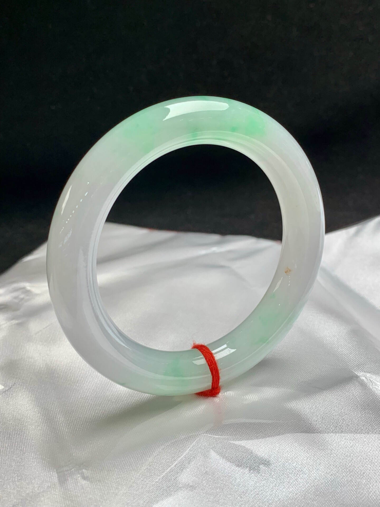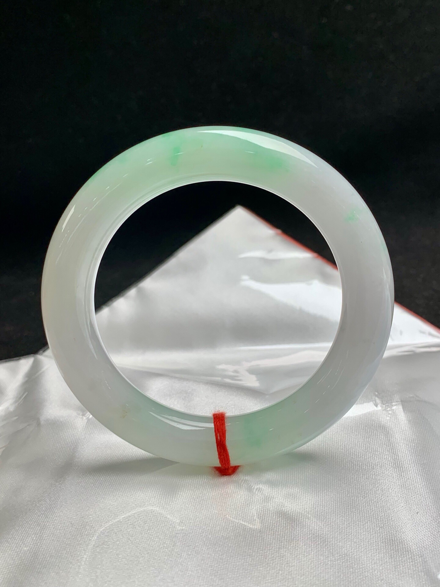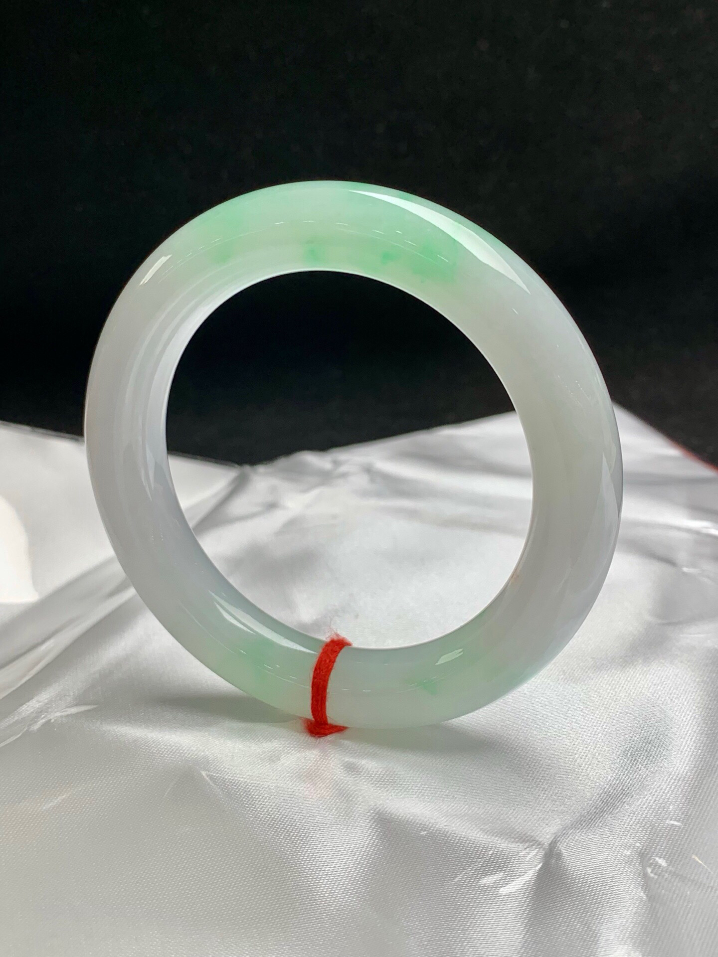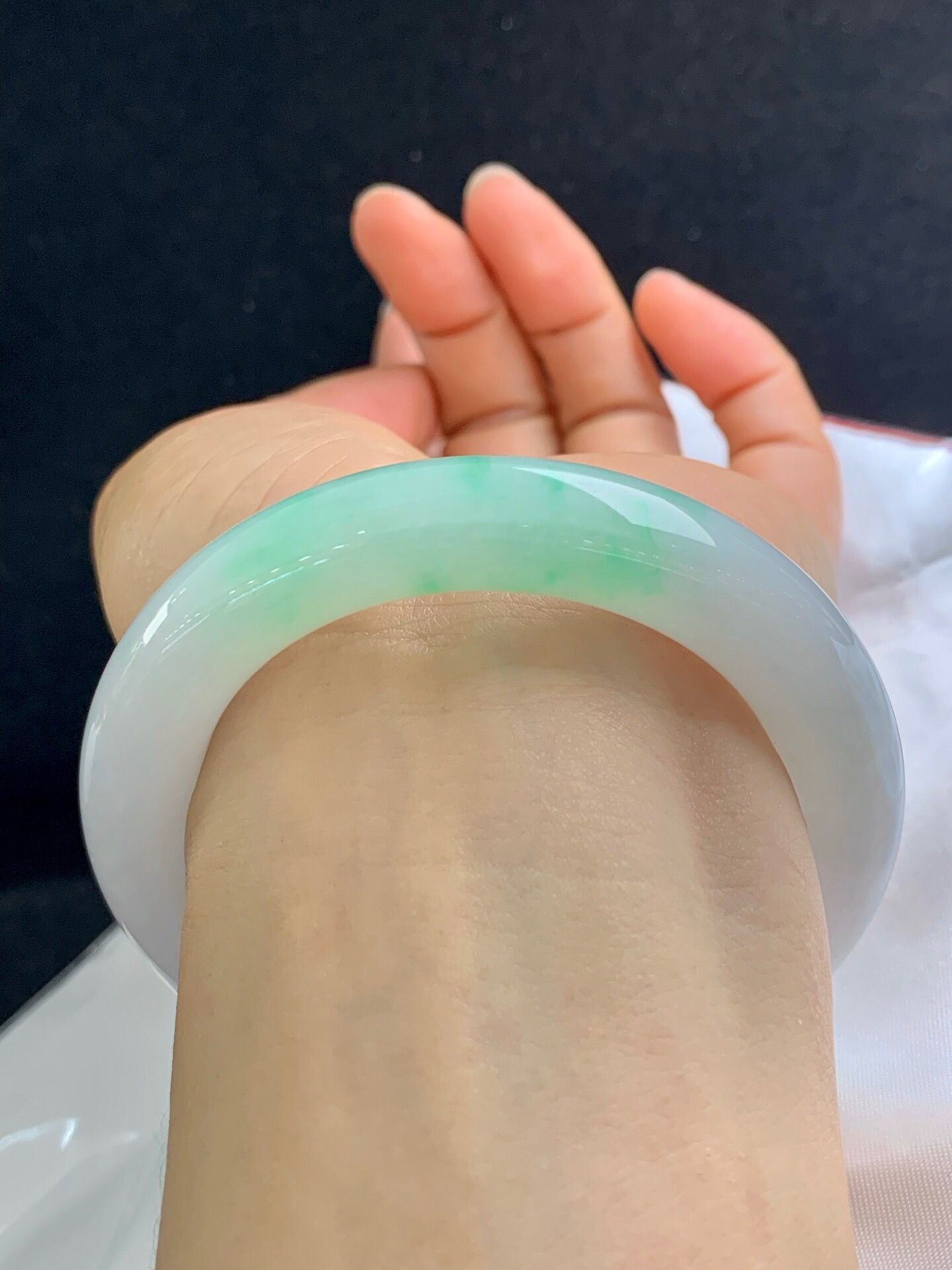 620011,54.8圈口,糯冰飘绿圆条福镯,白底飘甜绿花,带招财洒金点,种老水足,水润完美,尺寸:54.8-11.6-11.1,超值价💰66500 #优石客珠宝#香玉荟萃