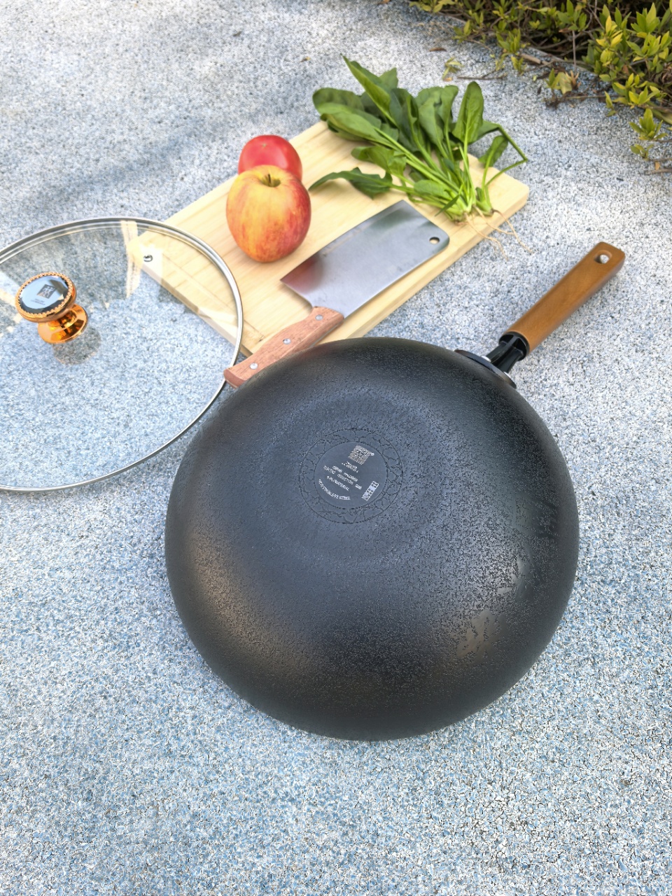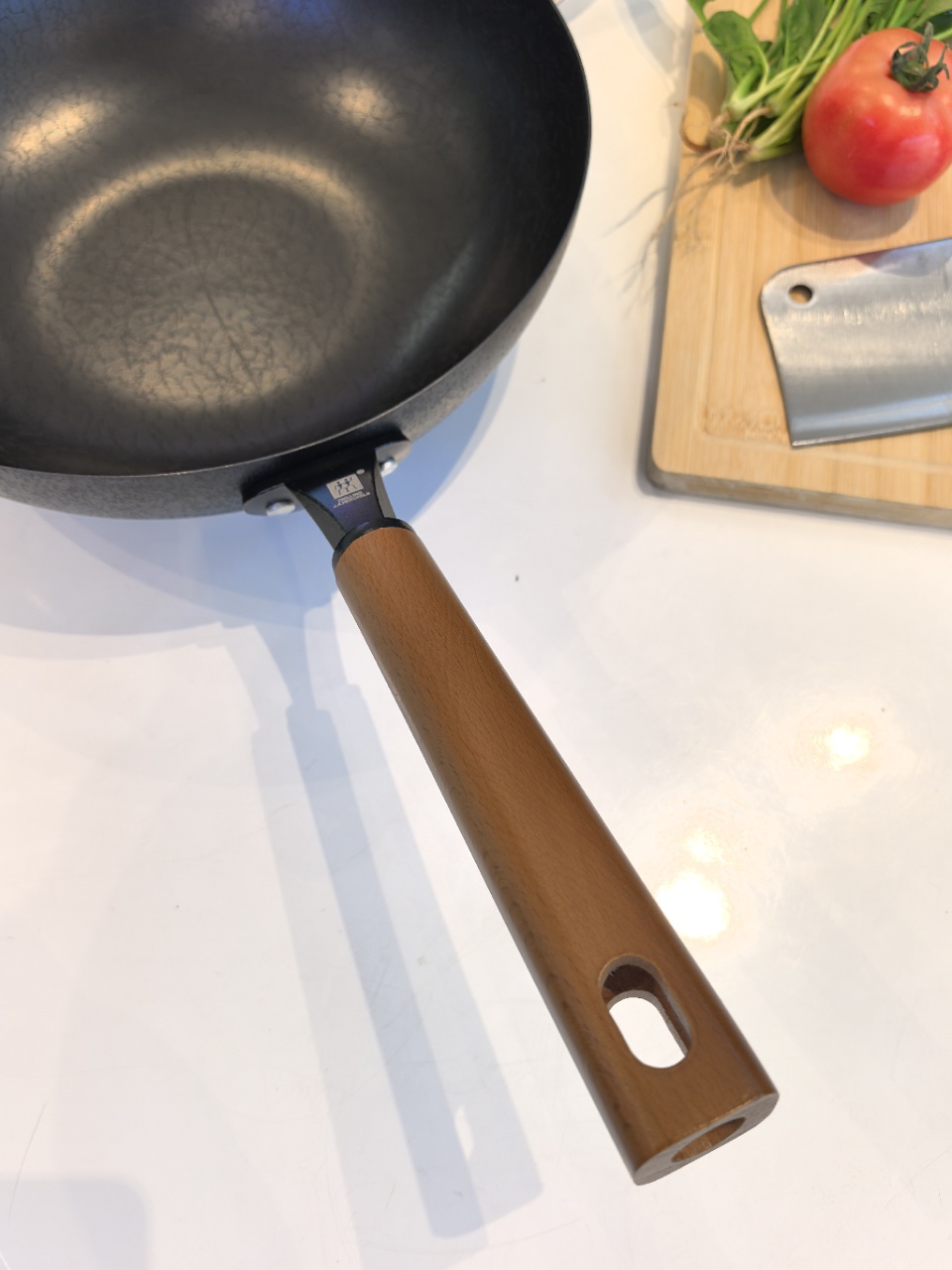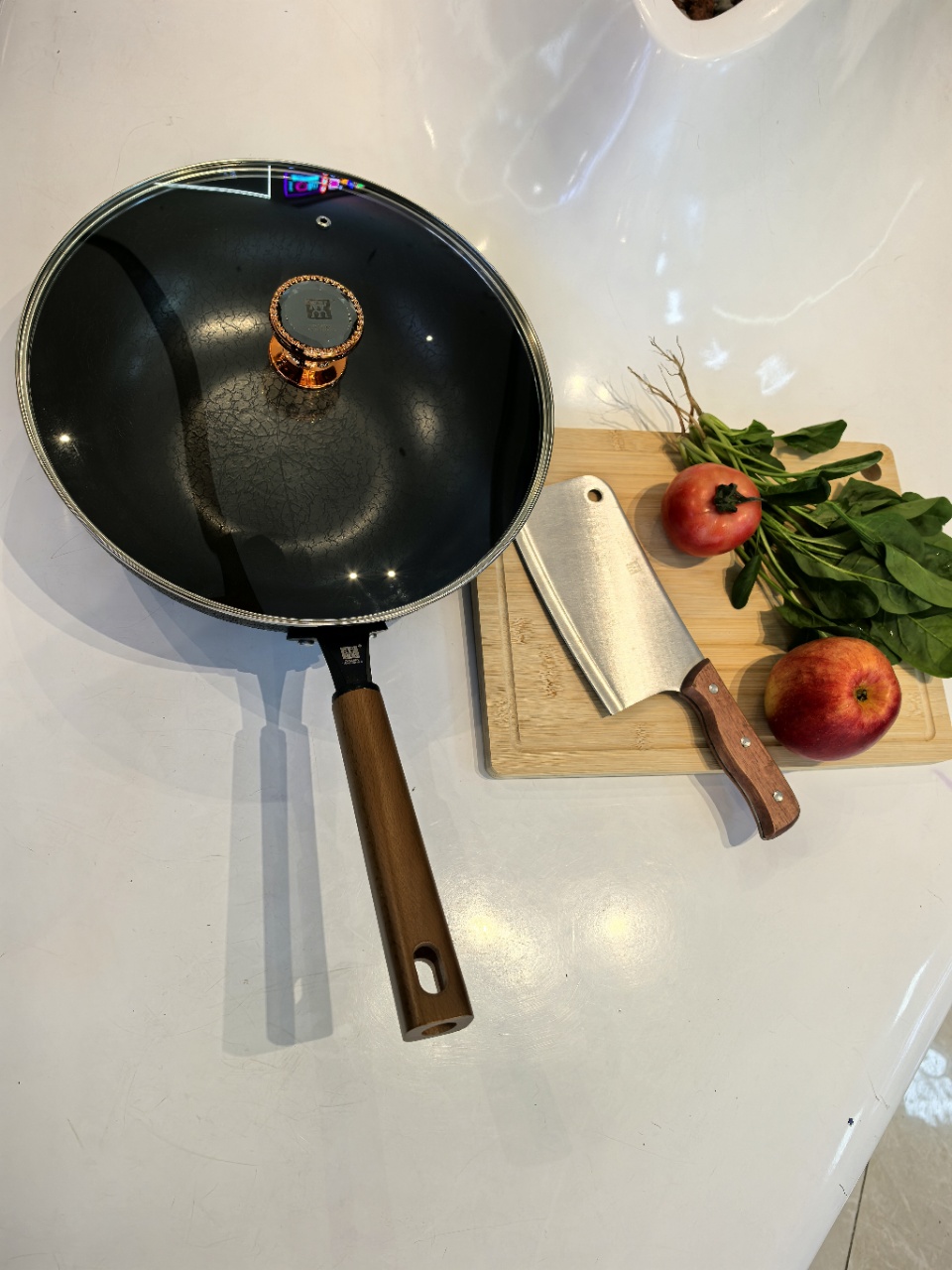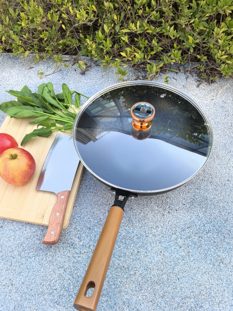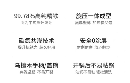 【产品特点】纯精铁打造,,健康无涂层,物理不粘锅免开锅,不挑灶具。易清洗,轻微油烟。精铁材质,一体成型。健康耐用不易糊!实木手柄。