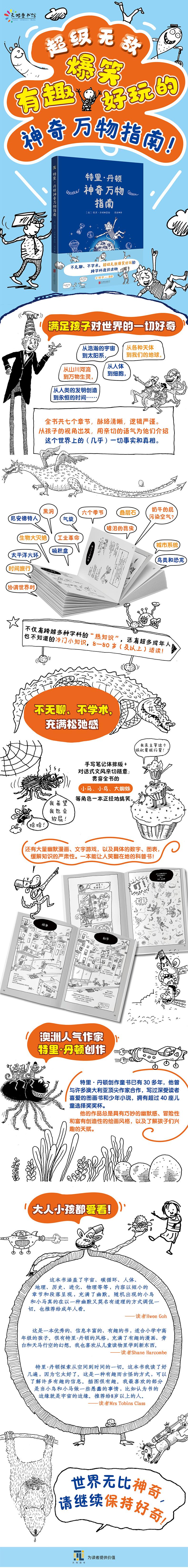 从宇宙到地球,从生命到细胞,从人类的一切发明创造到永恒的时间……澳洲知名作家特里·丹顿为孩子们创作了这本包罗万象的神奇万物科普书。他从孩子的视角出发,为他们介绍周围世界的几乎一切事实。不仅跨越多种学科,涉及广泛的科学类和历史类话题,而且丝毫不枯燥、不学术、超级有趣,穿插其中的漫画、搞笑角色令人捧腹大笑。 特里·丹顿的行文轻松幽默,手写笔记体排版和随笔插画令孩子们倍感亲切。关于宇宙和身边的万事万物,他们都能在这本书中找到有趣的答案。