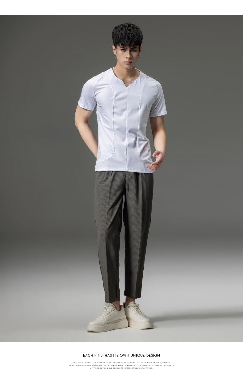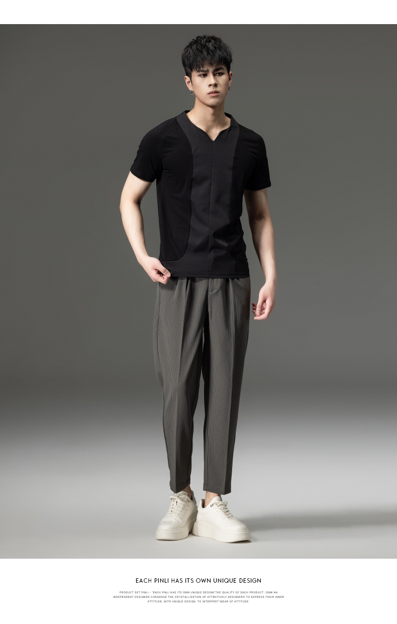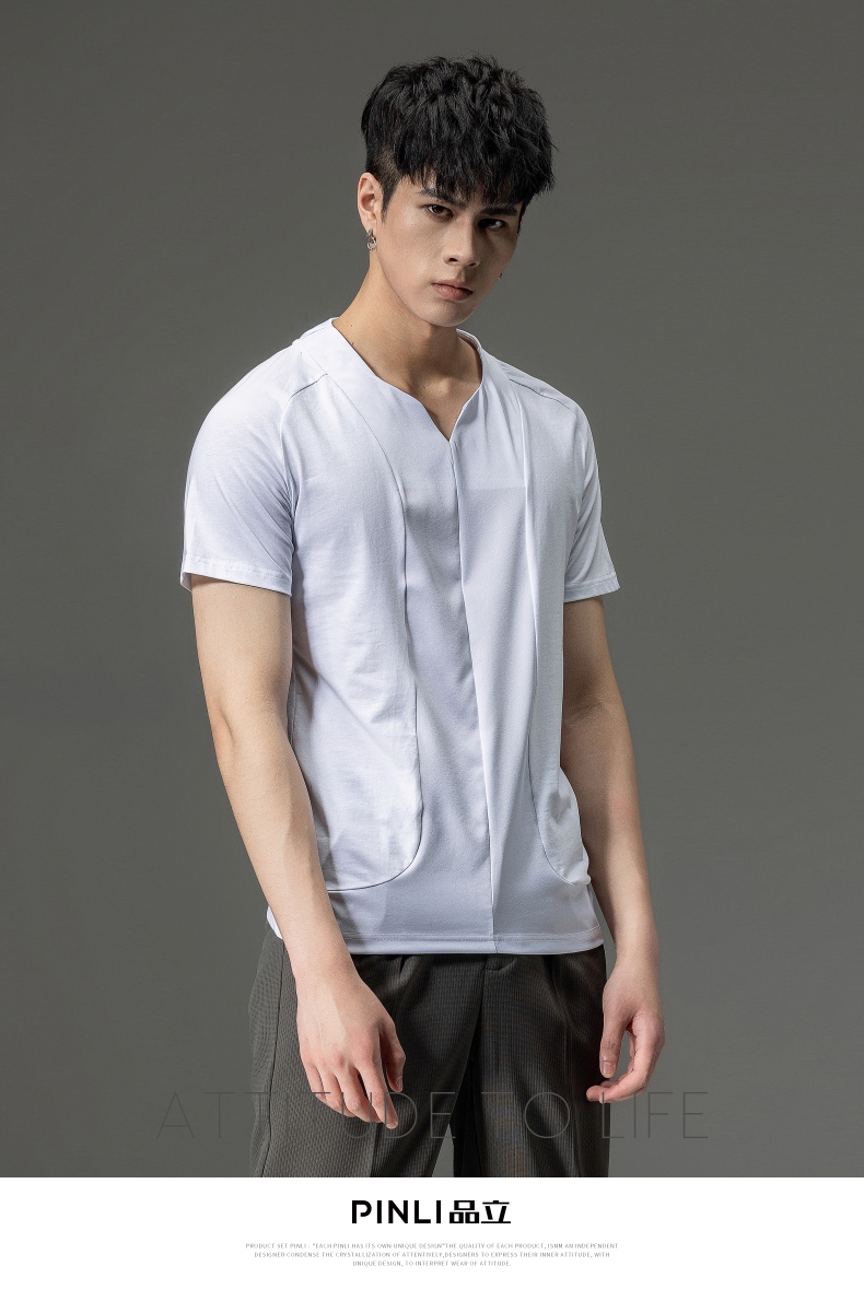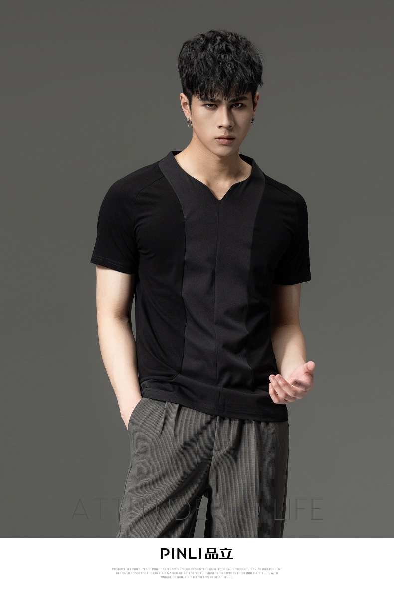 PINLI品立夏季新款男装修身V领上衣休闲短袖T恤纯色潮牌男士体恤B222111030