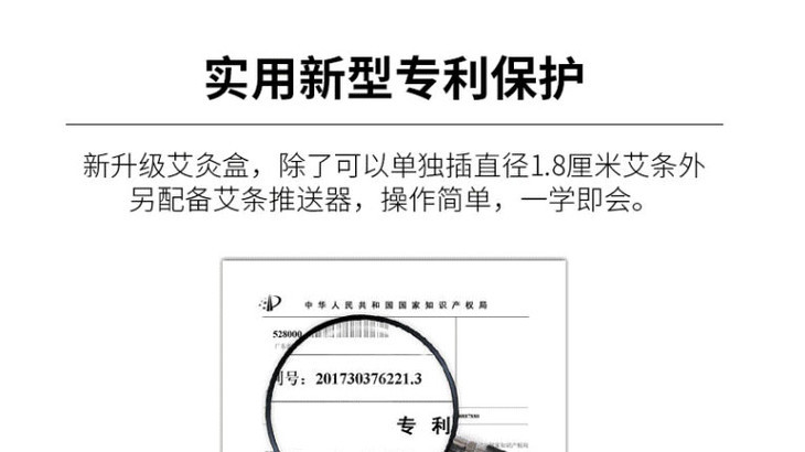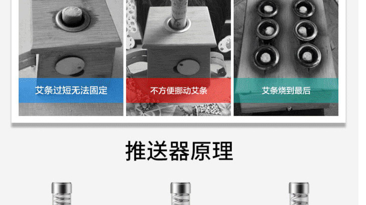 作 用:配合艾灸盒使用,起到“火头固定、自动送艾、自动弹灰”的作用。