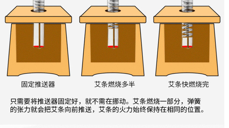 送艾器借助弹簧压力,使得火力点始终保持在所需位置,无需用手按压艾条;燃烧后的艾灰因为受到弹簧的挤压,也会自动掉落,无需手动弹灰;解放双手,节约人工。