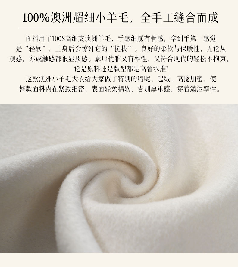 这款澳洲小羊毛大衣给大家做了特别的缩呢、起绒、高捻加密,使整款面料内在紧致细密,表面轻柔棉软,告别厚重感,穿着潇洒率性。