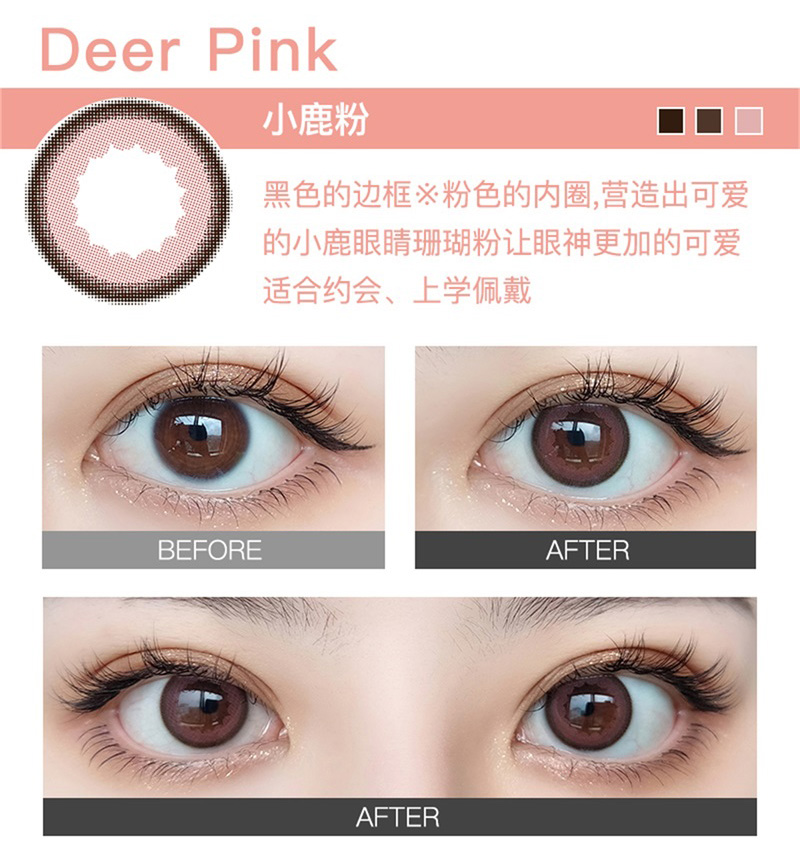 Deer Pink小鹿粉,淡淡的黑色边框搭配粉色内圈,像是可爱的小鹿眼睛,很甜美,但不会很夸张,适合可爱系女生;