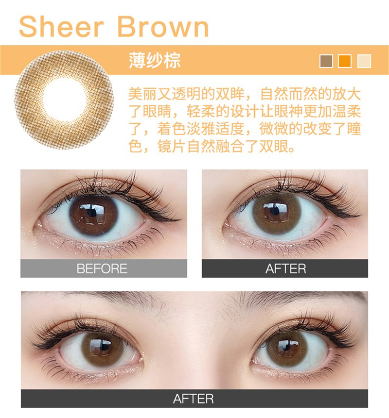 Sheer Brown薄纱棕,很淡雅,颜色比小鹿棕浅一些,微微改变了瞳色,自然放大了眼睛,日常化点小妆,很是温柔好看!