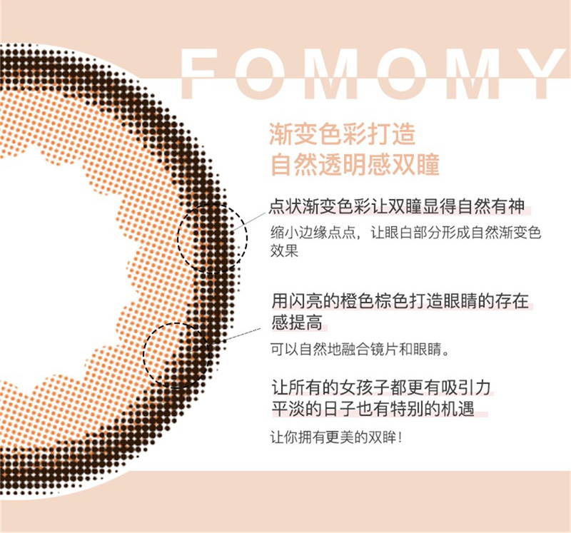 FOMOMY美瞳的材质都很不错,月抛采用ETAFLICON A,相比硅水凝胶在舒适度、视觉感等各方面都会更优秀,因为品牌特别在保存液里用了MOIST技术添加了MPC聚合物,所以直接拿出来就能戴,不用再过一遍护理液。月抛的镜片含水度38%,BC8.6,DIA14.1mm,都很适中,也是相对舒适的一个规格,直径不会大到很难戴。只要不是特别敏感,戴起来都不会有异物感,而且,一天下来基本不会觉得眼干。